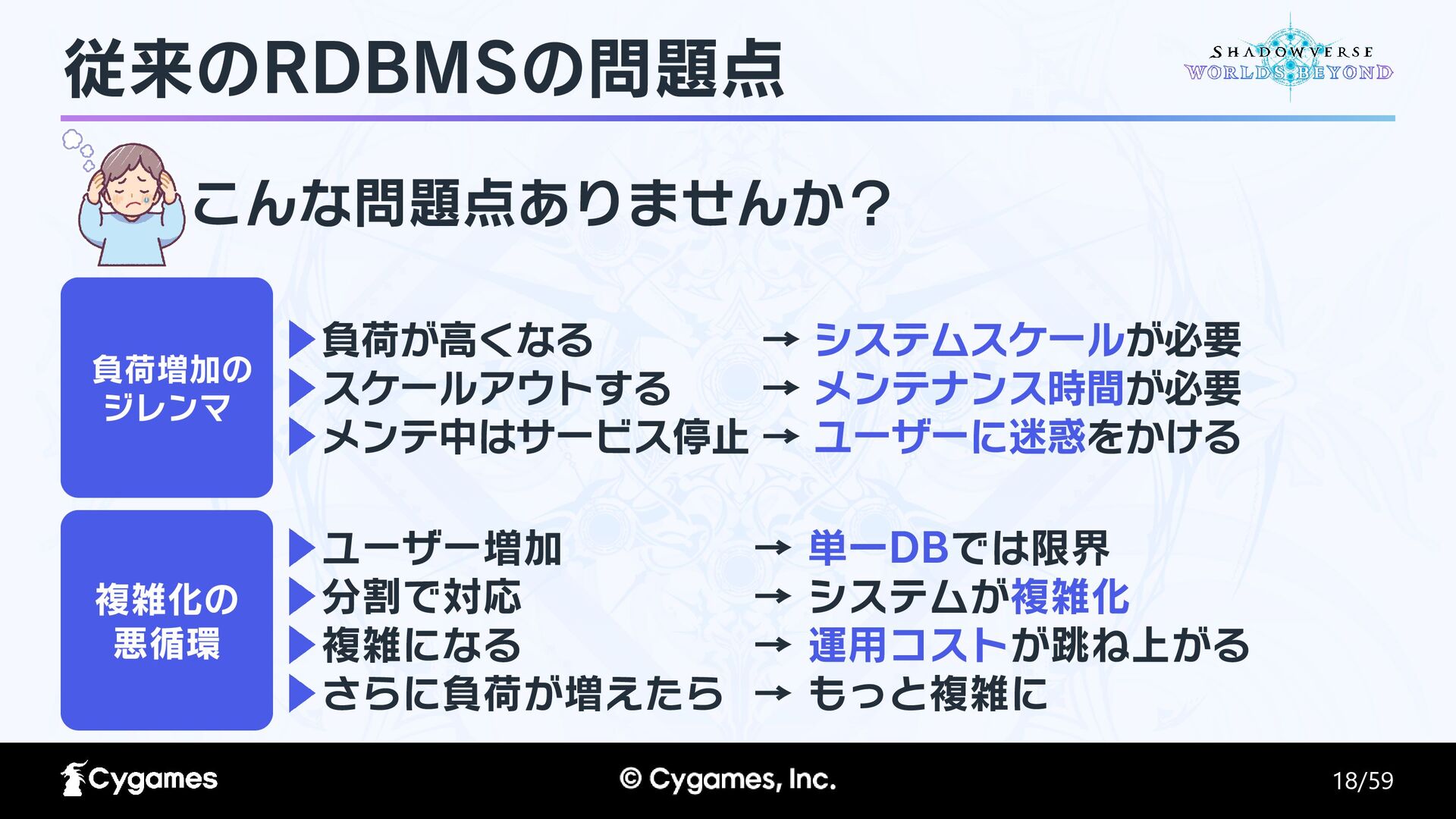 ユーザーに迷惑をかける ユーザー増加 → 単一DBでは限界 分割で対応 → システムが複雑化 複雑になる → 運用コストが跳ね上がる さらに負荷が増えたら → もっと複雑に 負荷増加の ジレンマ 複雑化の 悪循環 こんな問題点ありませんか?
