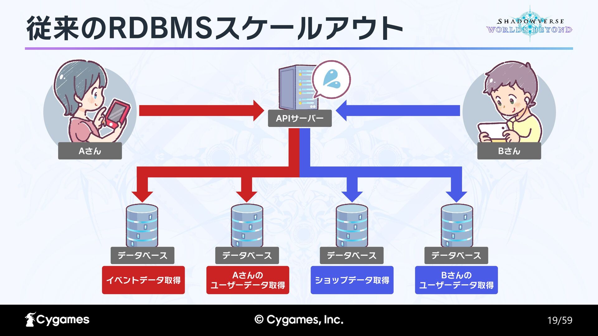 19/59 従来のRDBMSスケールアウト Aさん Bさん イベントデータ取得 Aさんの ユーザーデータ取得 ショップデータ取得 Bさんの ユーザーデータ取得