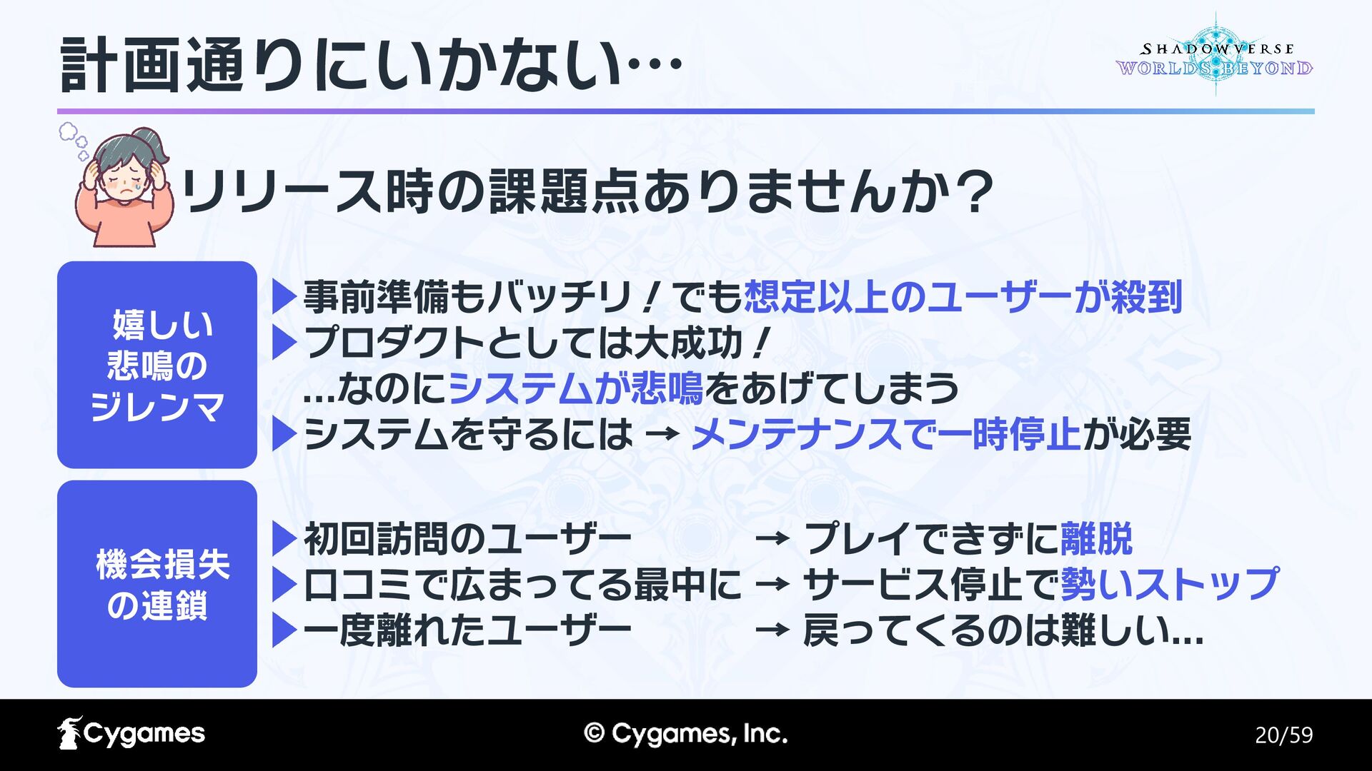 悲鳴の ジレンマ 初回訪問のユーザー → プレイできずに離脱 口コミで広まってる最中に → サービス停止で勢いストップ 一度離れたユーザー → 戻ってくるのは難しい... 機会損失 の連鎖
