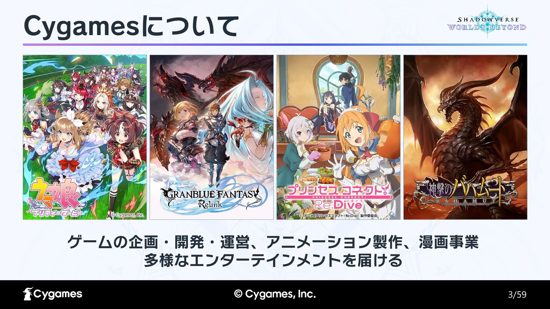 3/59 Cygamesについて ゲームの企画・開発・運営、アニメーション製作、漫画事業 多様なエンターテインメントを届ける