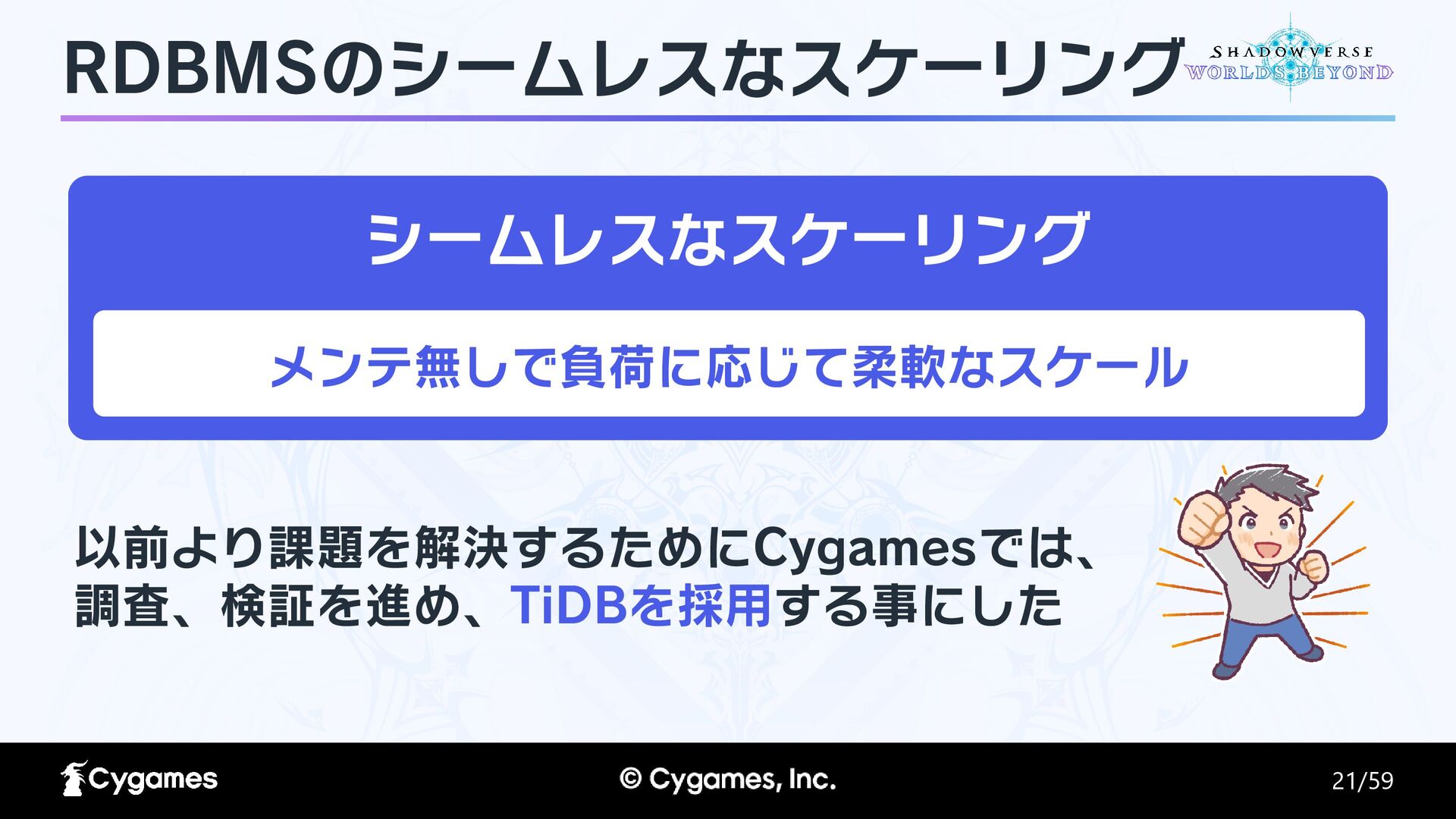 21/59 RDBMSのシームレスなスケーリング シームレスなスケーリング メンテ無しで負荷に応じて柔軟なスケール 以前より課題を解決するためにCygamesでは、 調査、検証を進め、TiDBを採用する事にした