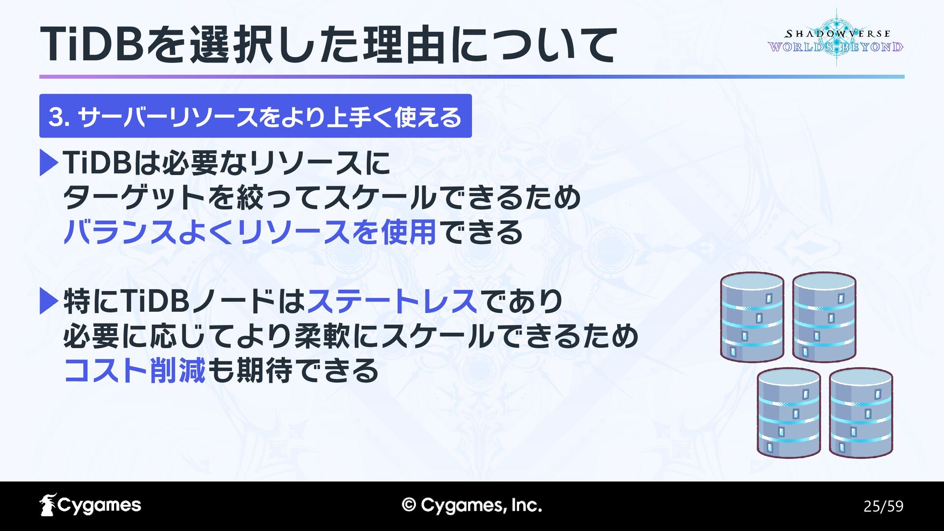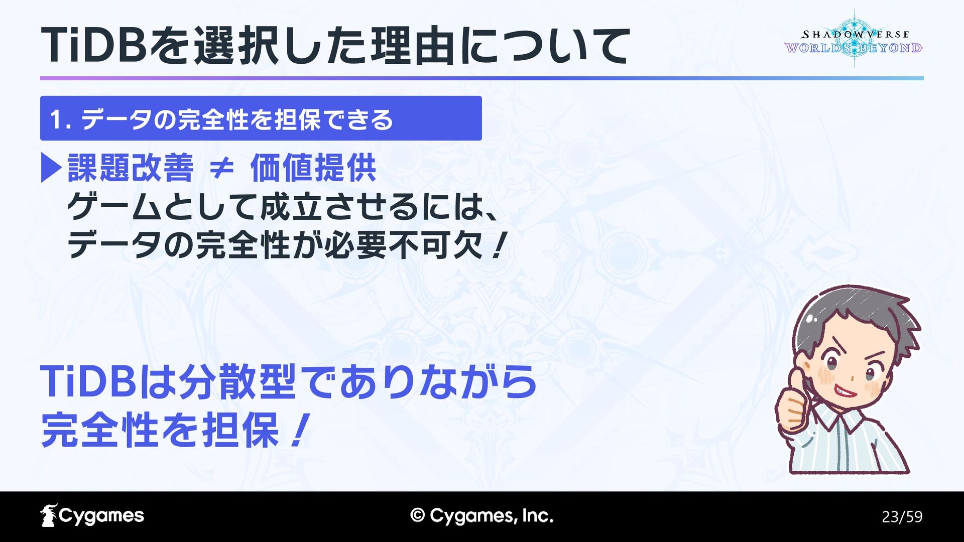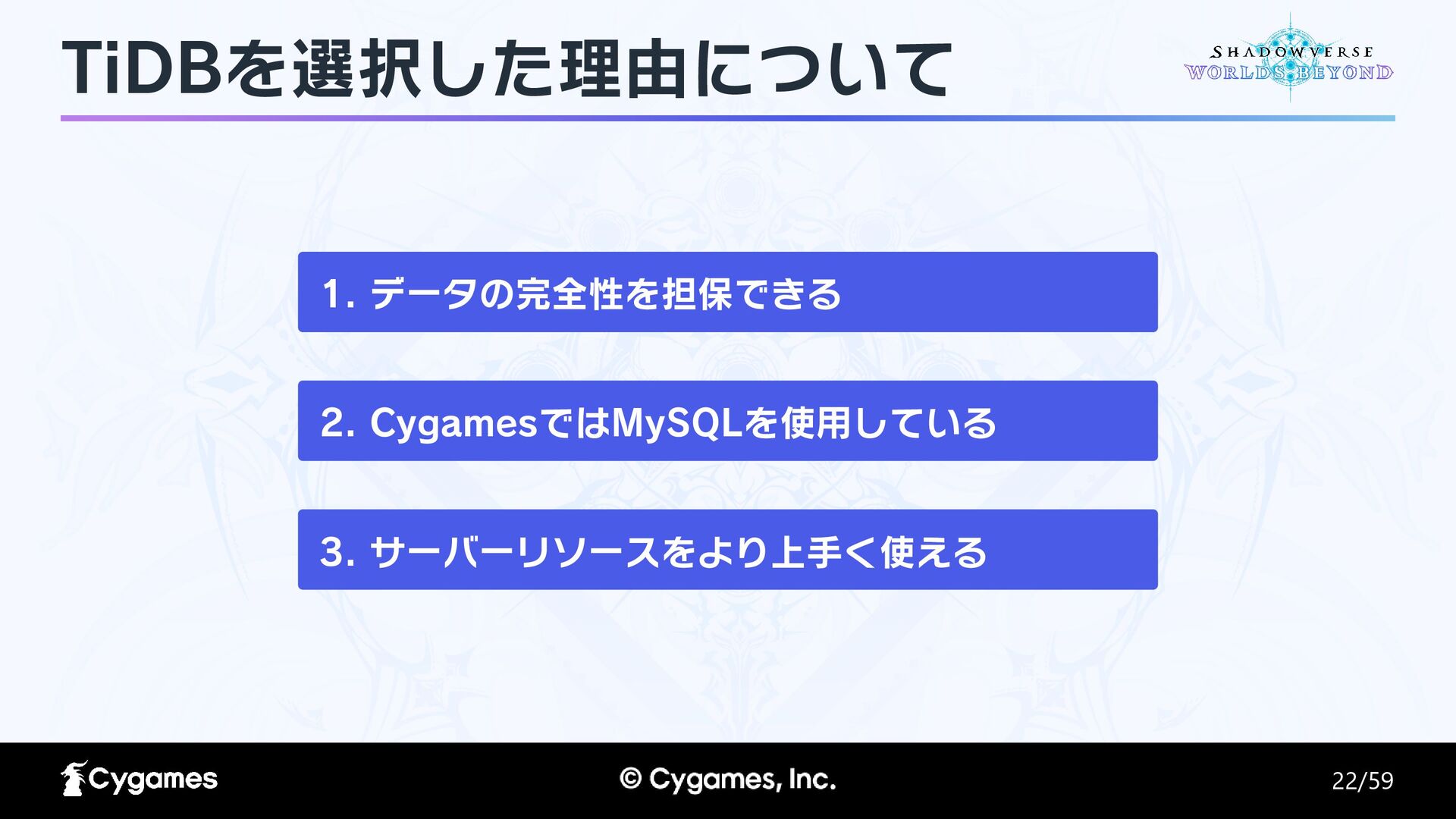 22/59 TiDBを選択した理由について 1. データの完全性を担保できる 2. CygamesではMySQLを使用している 3. サーバーリソースをより上手く使える
