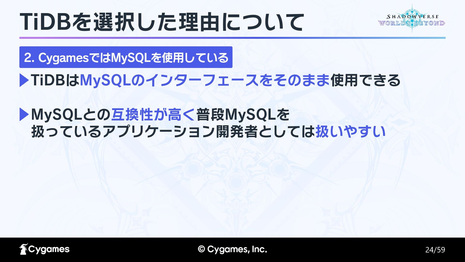 24/59 TiDBを選択した理由について TiDBはMySQLのインターフェースをそのまま使⽤できる MySQLとの互換性が⾼く普段MySQLを 扱っているアプリケーション開発者としては扱いやすい 2. CygamesではMySQLを使用している