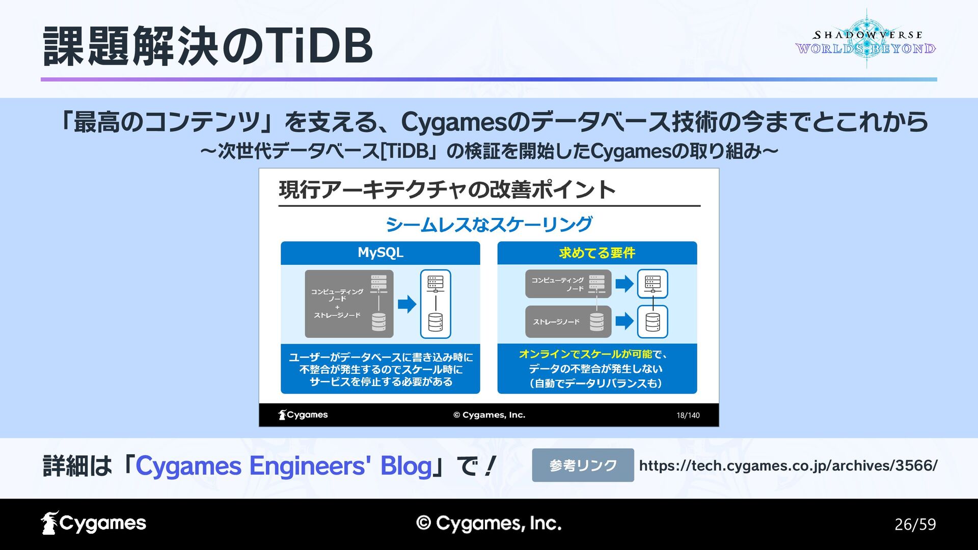 26/59 課題解決のTiDB https://tech.cygames.co.jp/archives/3566/ 参考リンク 「最高のコンテンツ」を支える、Cygamesのデータベース技術の今までとこれから ~次世代データベース[TiDB」の検証を開始したCygamesの取り組み~ 詳細は「Cygames Engineers' Blog」で!