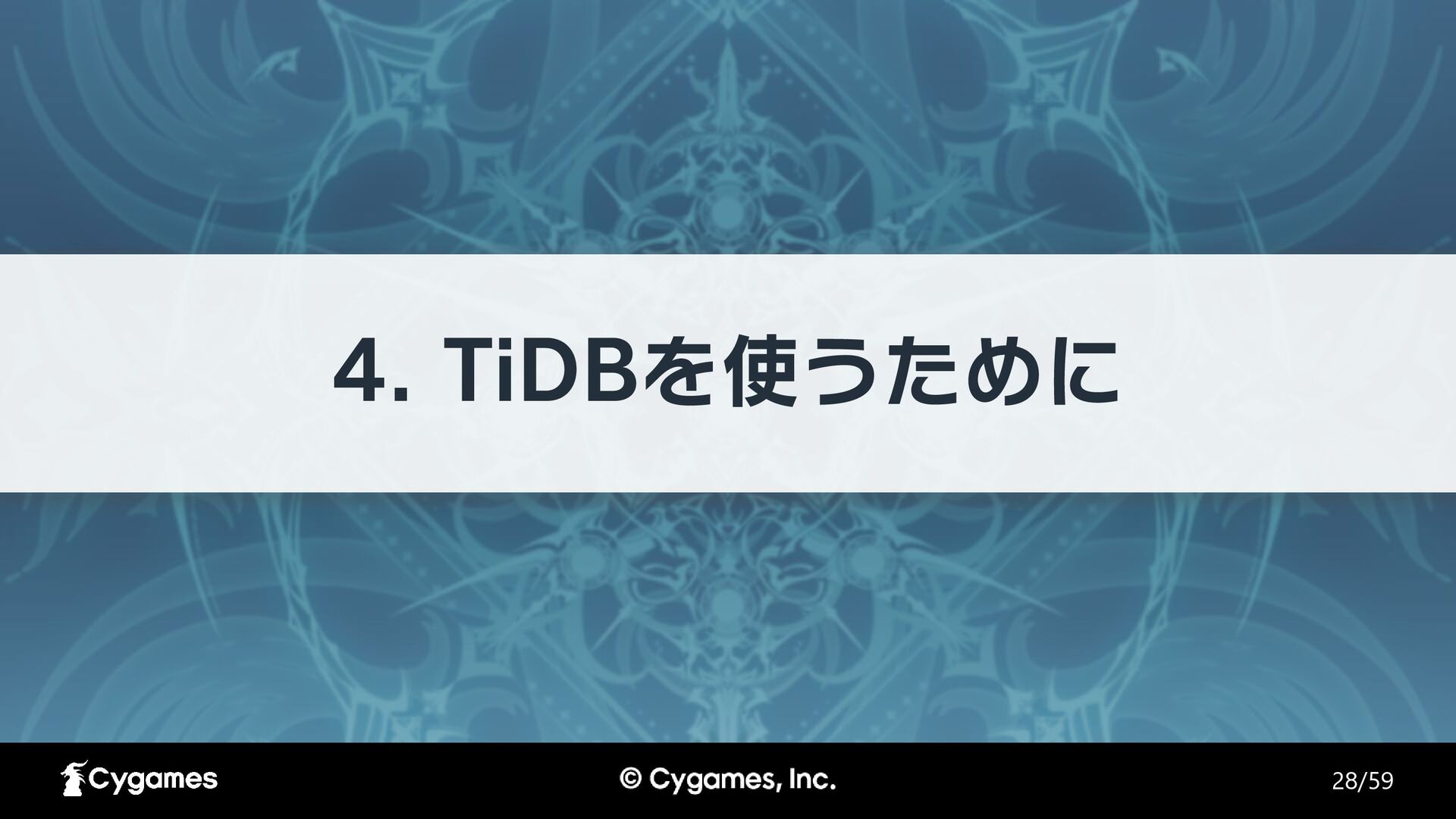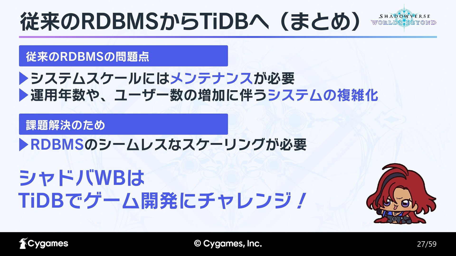 27/59 従来のRDBMSからTiDBへ(まとめ) シャドバWBは TiDBでゲーム開発にチャレンジ! システムスケールにはメンテナンスが必要 運用年数や、ユーザー数の増加に伴うシステムの複雑化 従来のRDBMSの問題点 RDBMSのシームレスなスケーリングが必要 課題解決のため