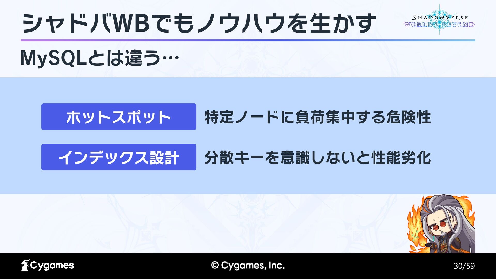 30/59 シャドバWBでもノウハウを生かす MySQLとは違う… 特定ノードに負荷集中する危険性 ホットスポット 分散キーを意識しないと性能劣化 インデックス設計
