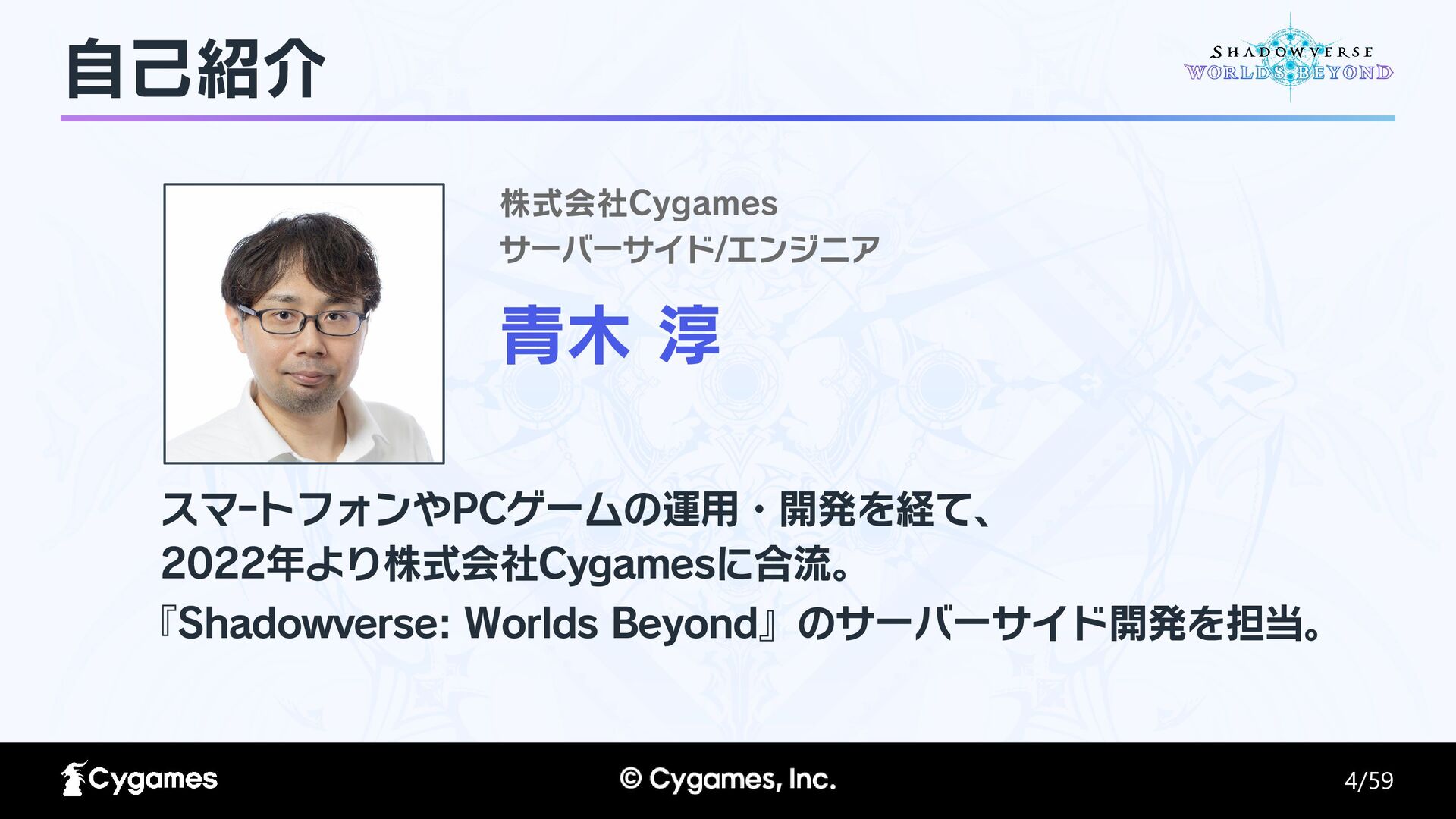 4/59 自己紹介 青木 淳 株式会社Cygames サーバーサイド/エンジニア スマートフォンやPCゲームの運用・開発を経て、 2022年より株式会社Cygamesに合流。 『Shadowverse: Worlds