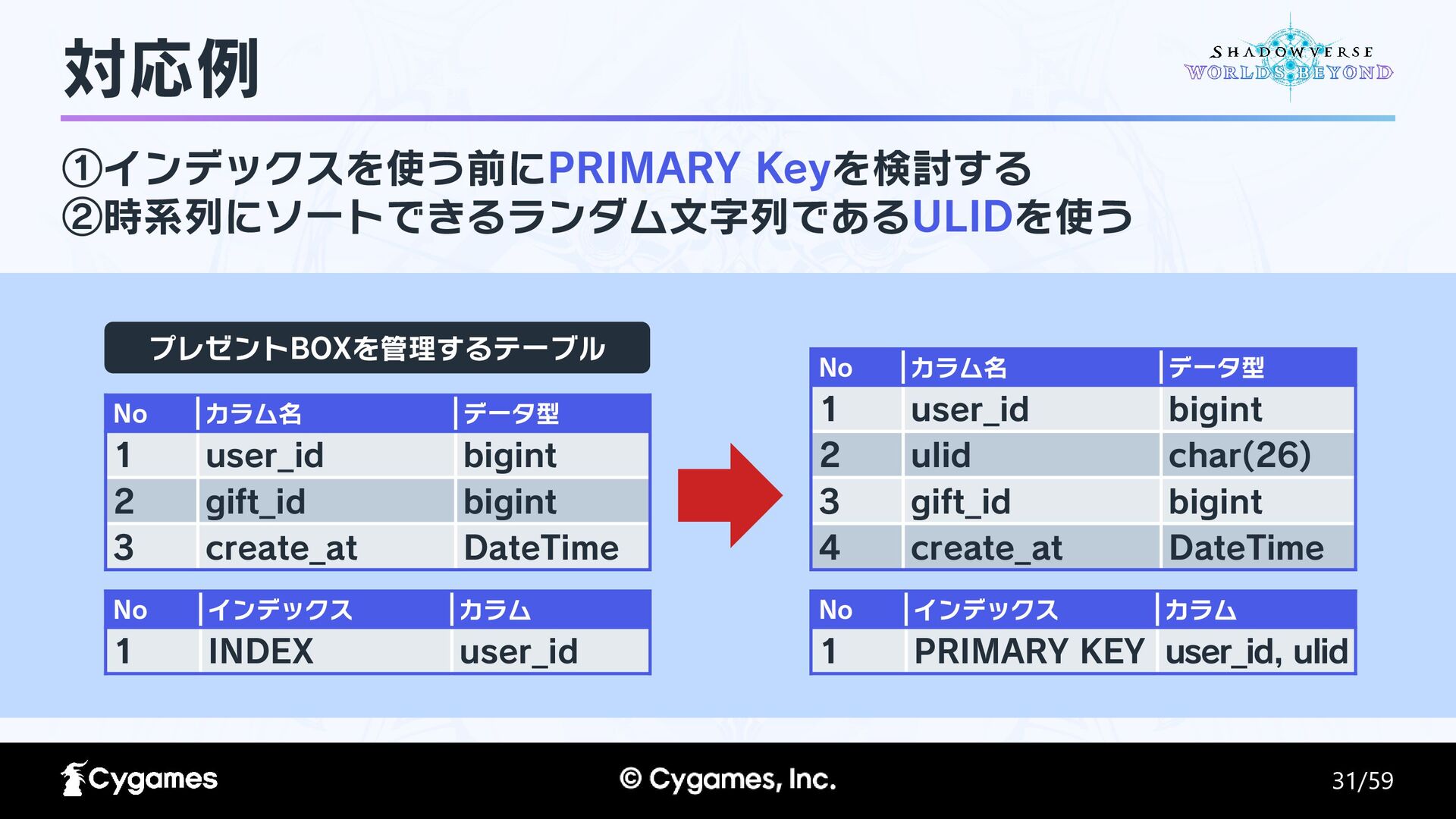 31/59 対応例 ①インデックスを使う前にPRIMARY Keyを検討する ②時系列にソートできるランダム文字列であるULIDを使う No カラム名 データ型 1 user_id