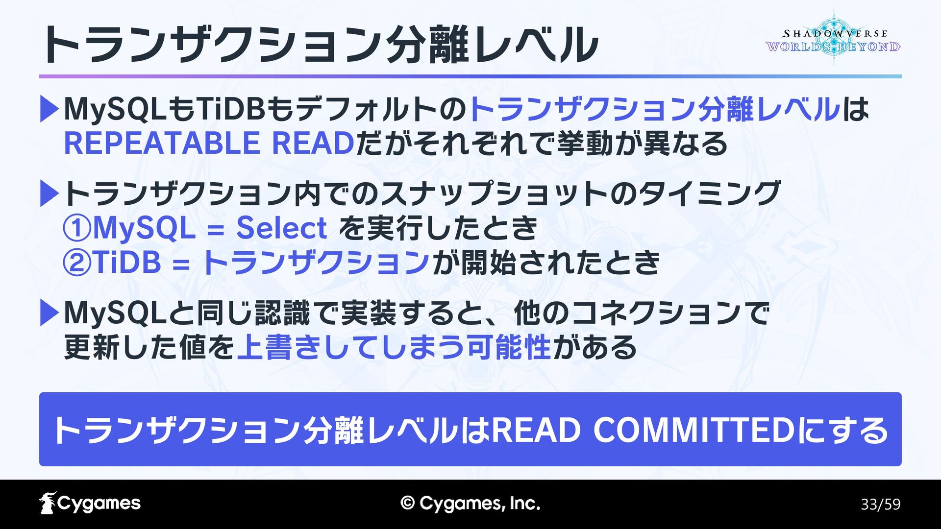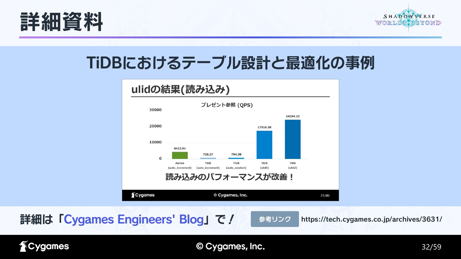 32/59 詳細資料 https://tech.cygames.co.jp/archives/3631/ 参考リンク 詳細は「Cygames Engineers' Blog」で! TiDBにおけるテーブル設計と最適化の事例