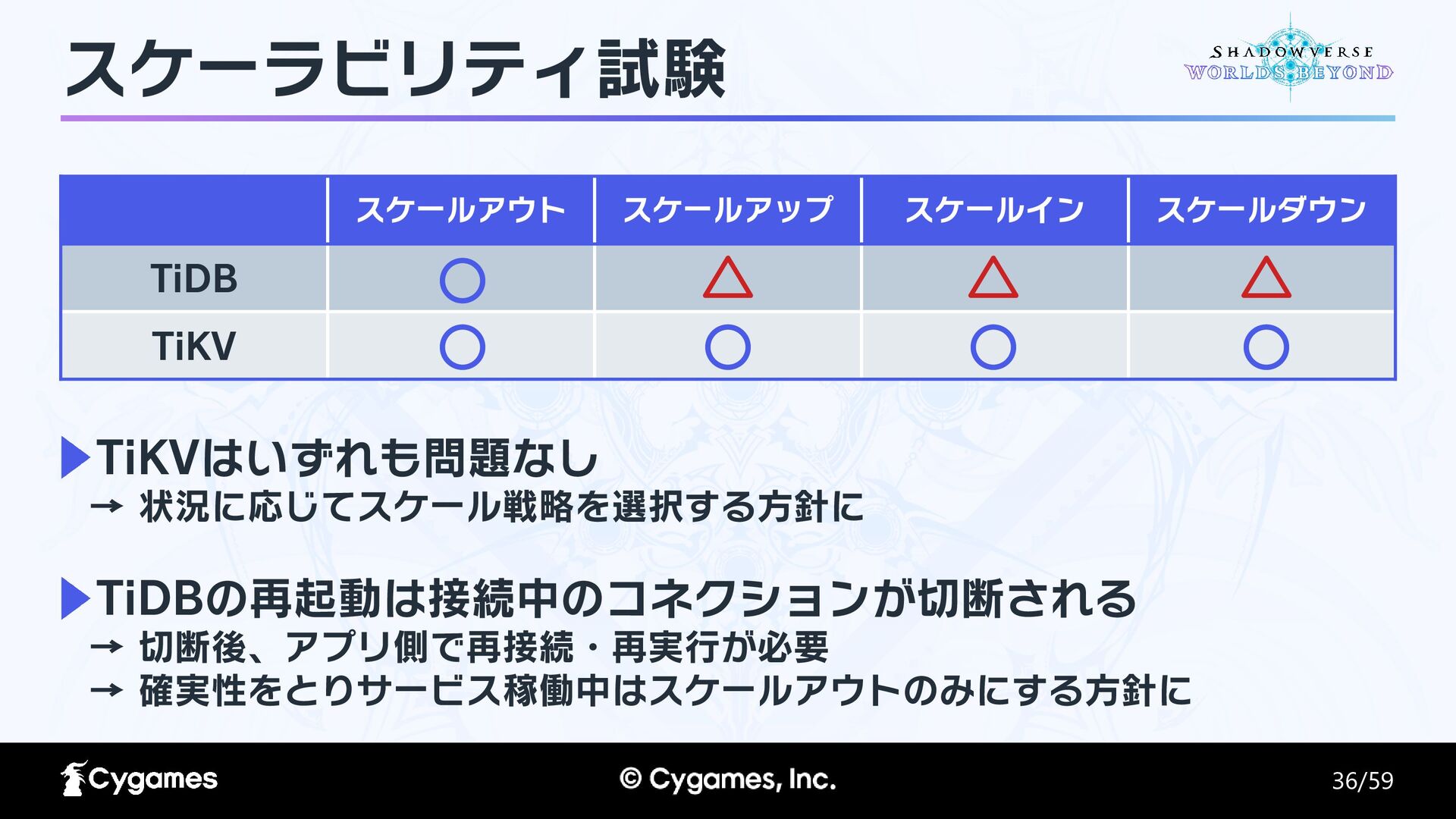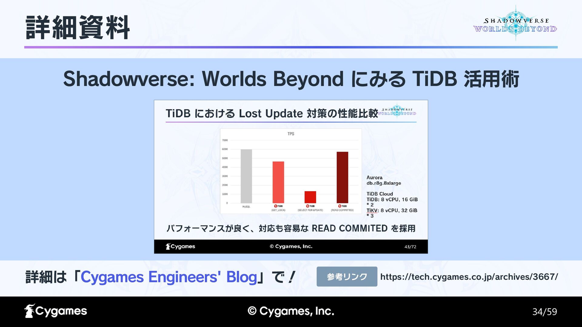 34/59 詳細資料 https://tech.cygames.co.jp/archives/3667/ 参考リンク Shadowverse: Worlds Beyond にみる TiDB 活用術