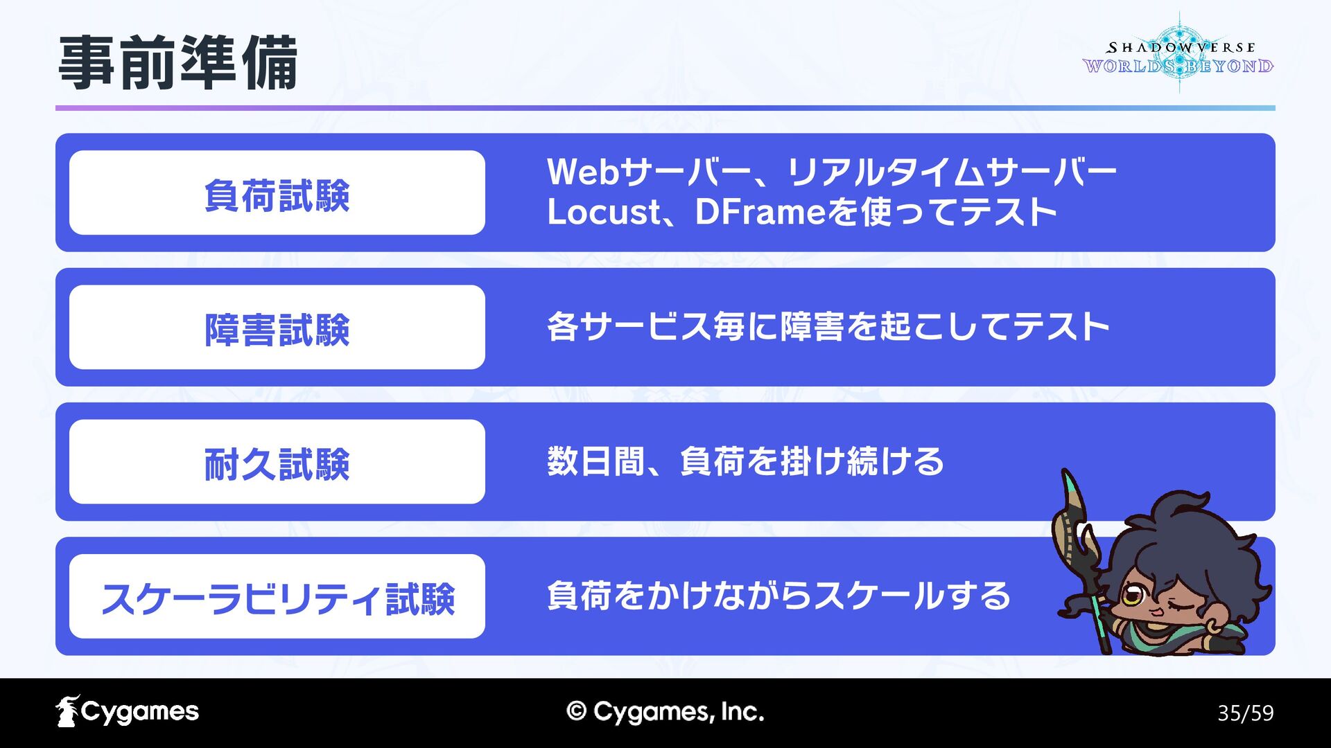 35/59 Webサーバー、リアルタイムサーバー Locust、DFrameを使ってテスト 負荷試験 各サービス毎に障害を起こしてテスト 障害試験 負荷をかけながらスケールする スケーラビリティ試験 数日間、負荷を掛け続ける 耐久試験