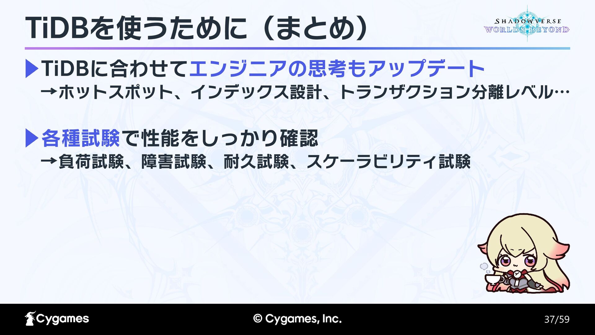 37/59 TiDBを使うために(まとめ) TiDBに合わせてエンジニアの思考もアップデート →ホットスポット、インデックス設計、トランザクション分離レベル… 各種試験で性能をしっかり確認 →負荷試験、障害試験、耐久試験、スケーラビリティ試験