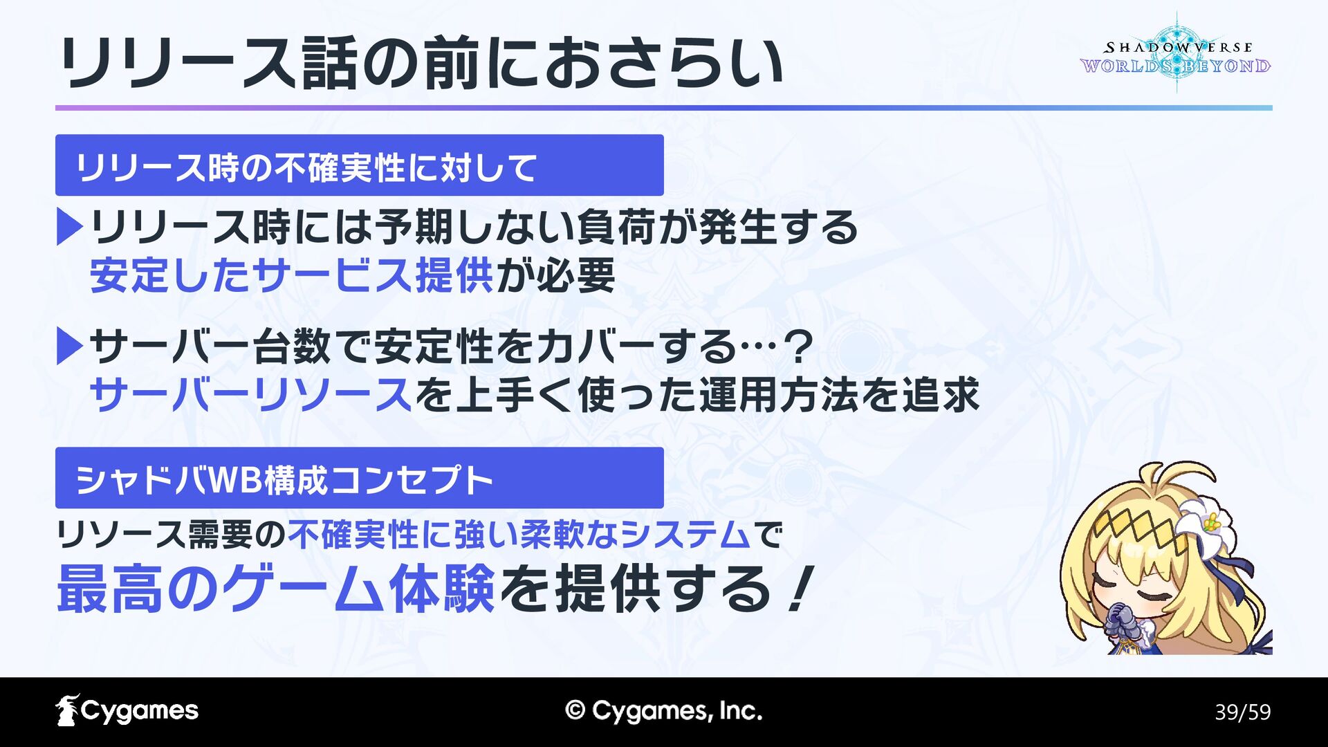 39/59 リリース話の前におさらい リリース時には予期しない負荷が発生する 安定したサービス提供が必要 サーバー台数で安定性をカバーする…? サーバーリソースを上手く使った運用方法を追求 リリース時の不確実性に対して リソース需要の不確実性に強い柔軟なシステムで 最高のゲーム体験を提供する! シャドバWB構成コンセプト
