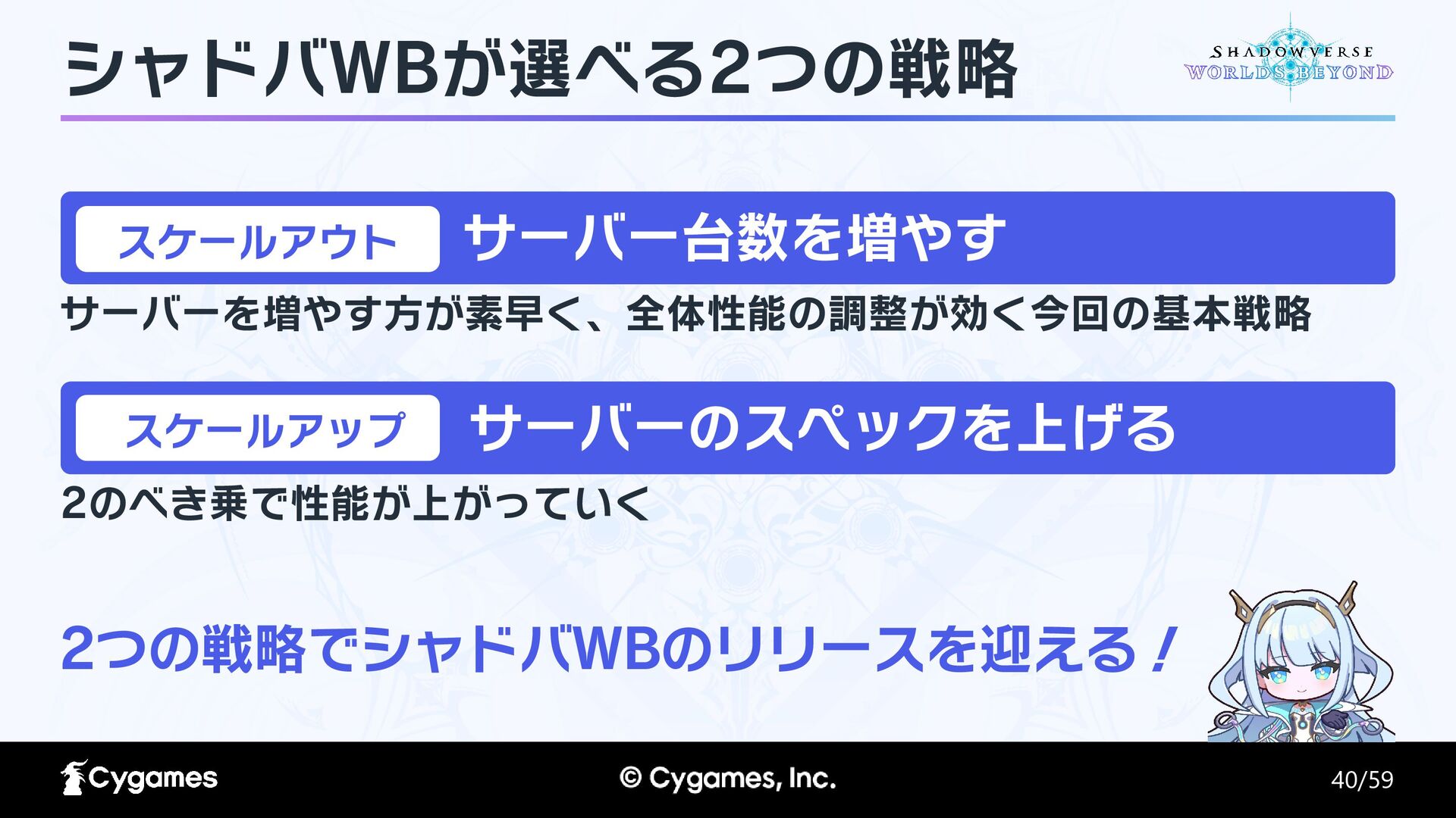 40/59 シャドバWBが選べる2つの戦略 2つの戦略でシャドバWBのリリースを迎える! サーバー台数を増やす スケールアウト サーバーを増やす方が素早く、全体性能の調整が効く今回の基本戦略 2のべき乗で性能が上がっていく サーバーのスペックを上げる スケールアップ