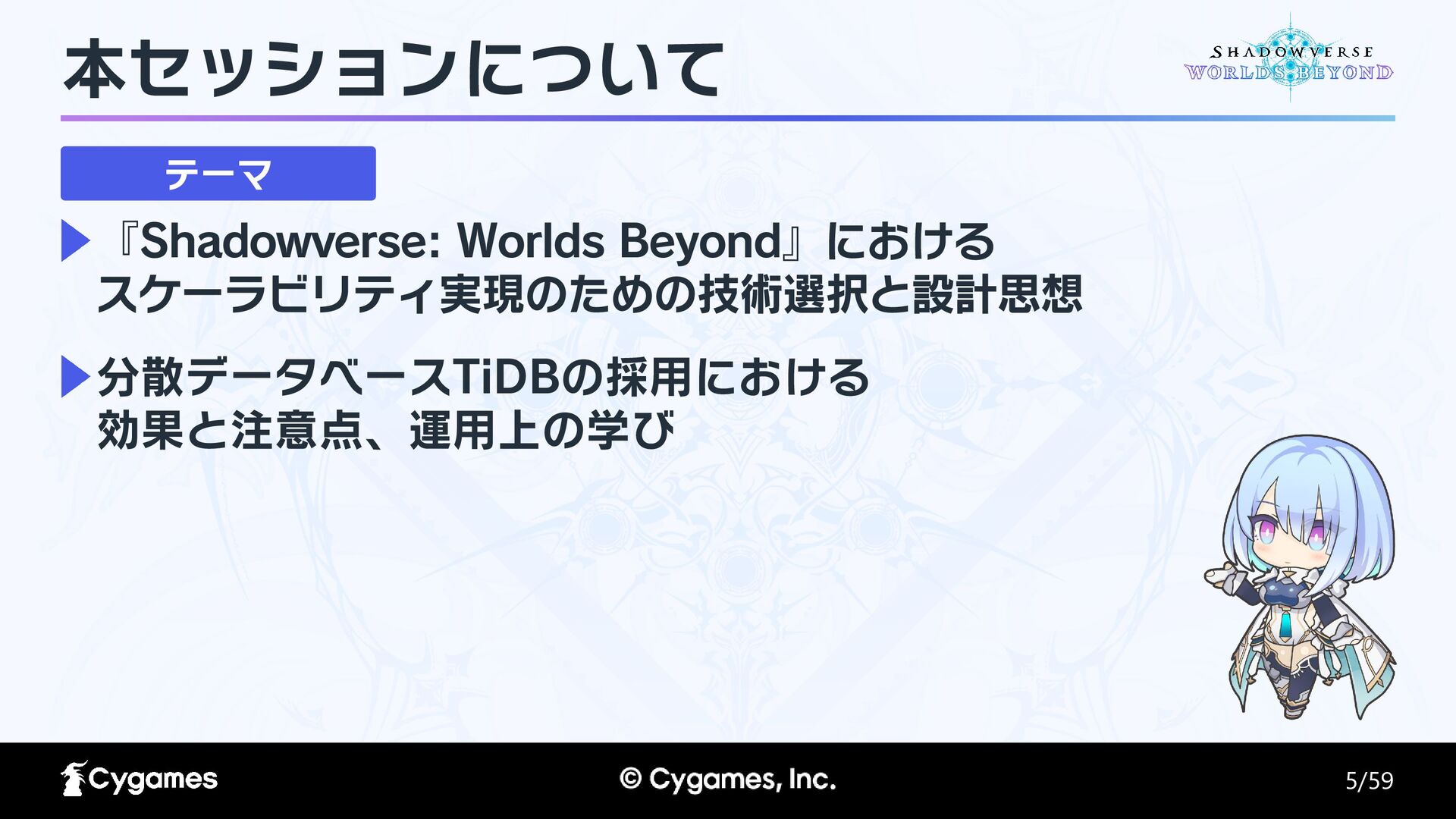5/59 本セッションについて テーマ 『Shadowverse: Worlds Beyond』における スケーラビリティ実現のための技術選択と設計思想 分散データベースTiDBの採用における 効果と注意点、運用上の学び