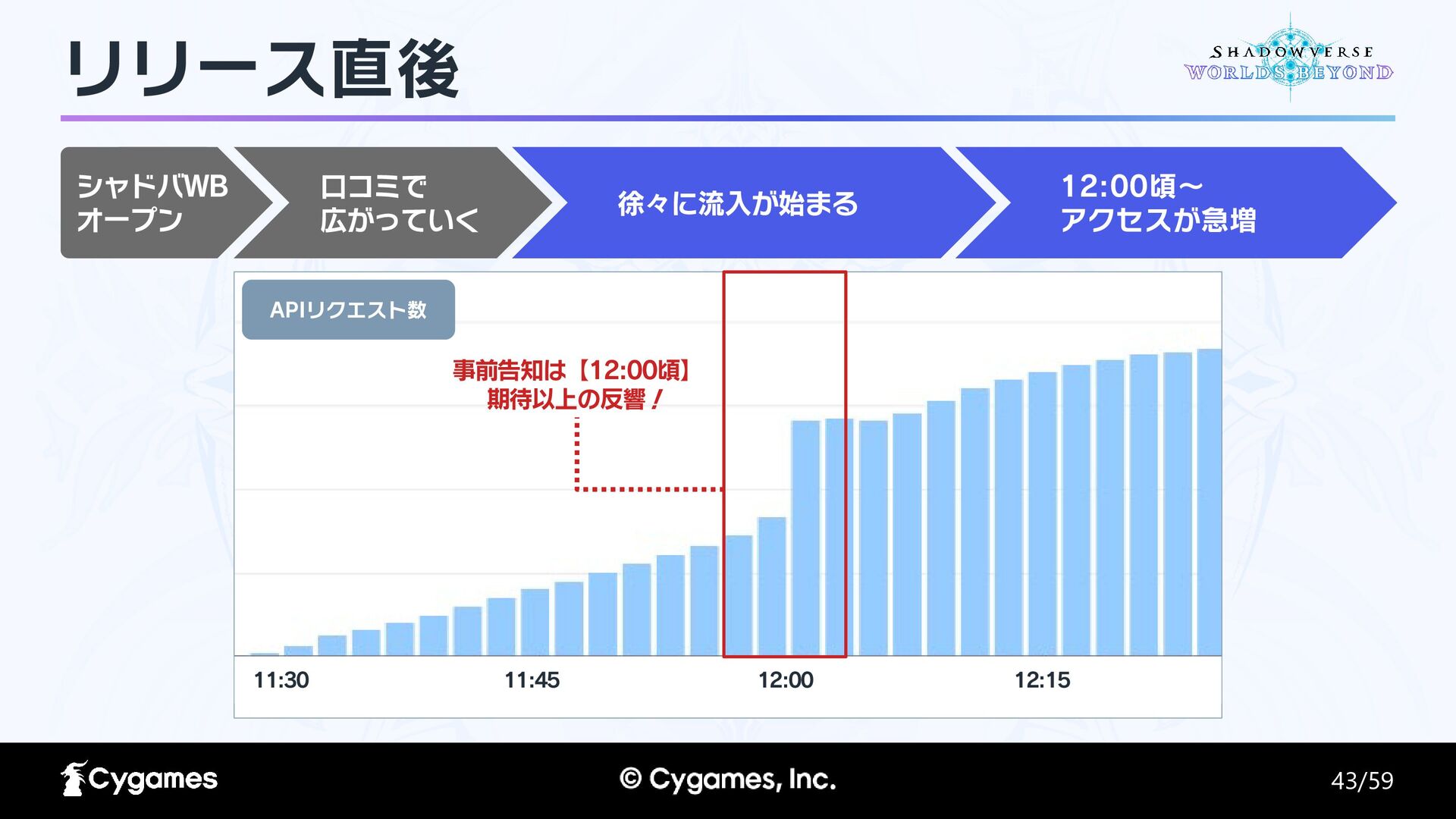 43/59 12:00 12:15 11:45 11:30 リリース直後 シャドバWB オープン 口コミで 広がっていく