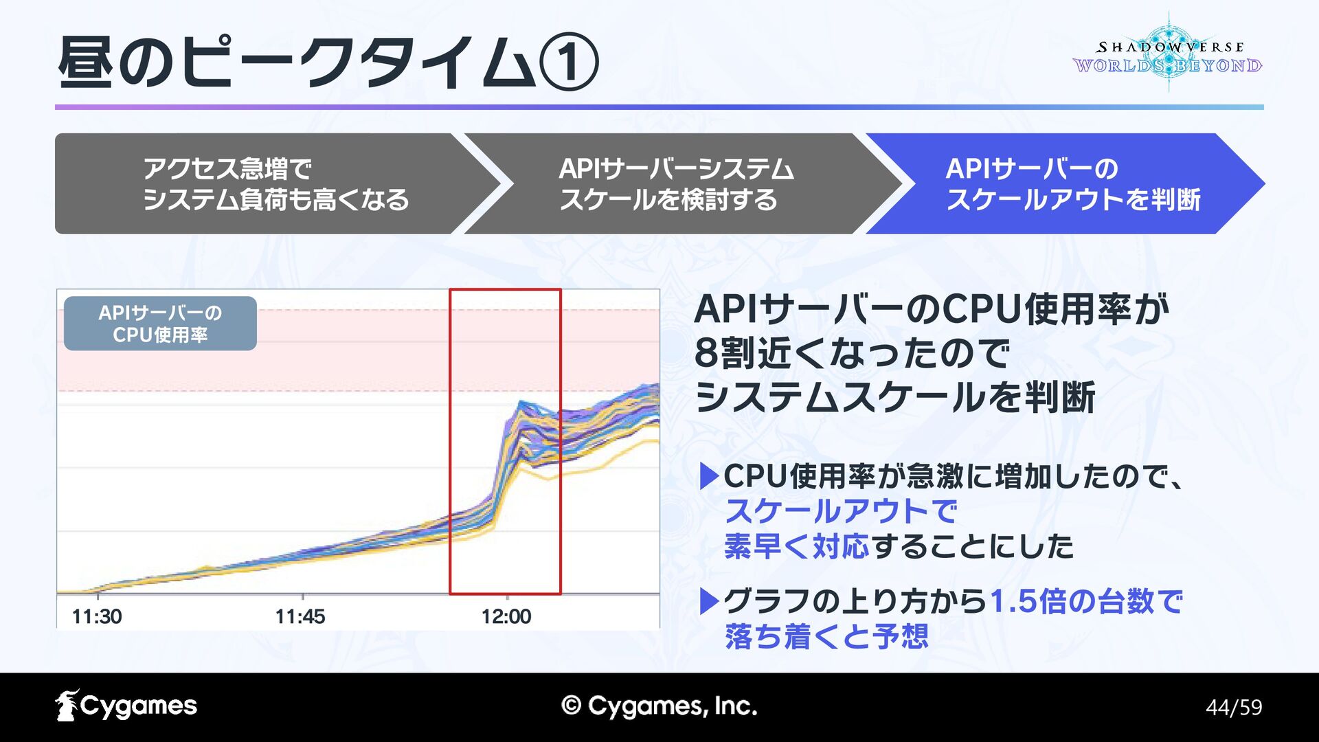 44/59 昼のピークタイム① APIサーバーのCPU使用率が 8割近くなったので システムスケールを判断 CPU使用率が急激に増加したので、 スケールアウトで 素早く対応することにした グラフの上り方から1.5倍の台数で 落ち着くと予想