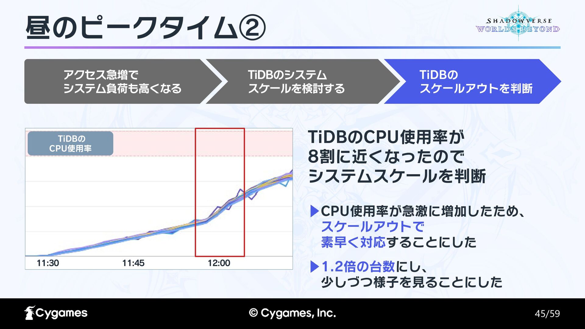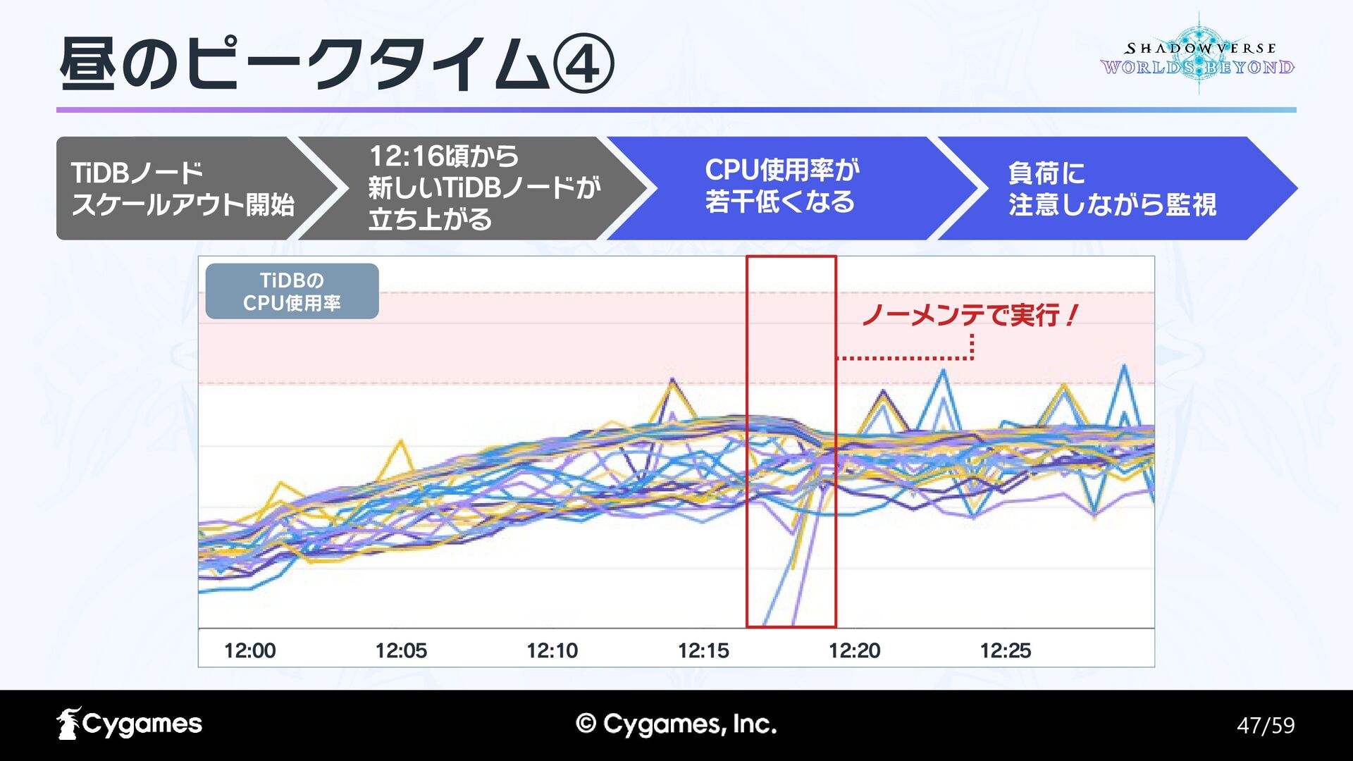 45/59 昼のピークタイム② アクセス急増で システム負荷も高くなる TiDBのシステム スケールを検討する TiDBの スケールアウトを判断 TiDBの CPU使用率