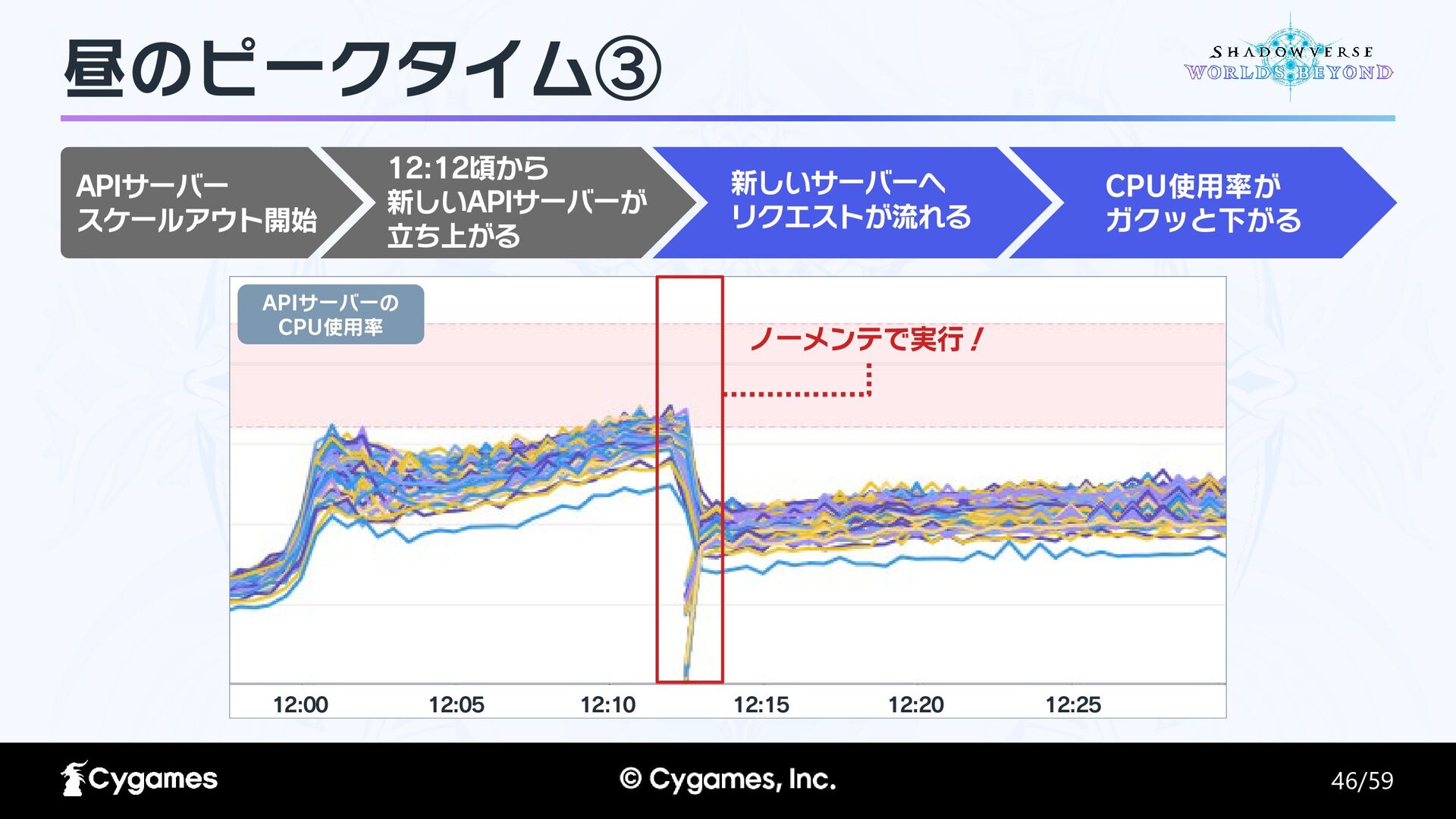 46/59 昼のピークタイム③ APIサーバー スケールアウト開始 12:12頃から 新しいAPIサーバーが 立ち上がる 新しいサーバーへ リクエストが流れる CPU使用率が
