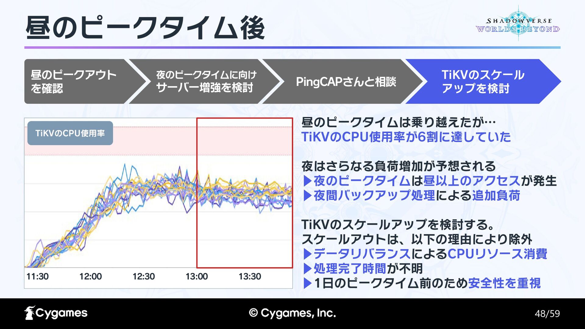 48/59 昼のピークタイム後 昼のピークタイムは乗り越えたが… TiKVのCPU使用率が6割に達していた 夜はさらなる負荷増加が予想される 夜のピークタイムは昼以上のアクセスが発生 夜間バックアップ処理による追加負荷 TiKVのスケールアップを検討する。 スケールアウトは、以下の理由により除外 データリバランスによるCPUリソース消費