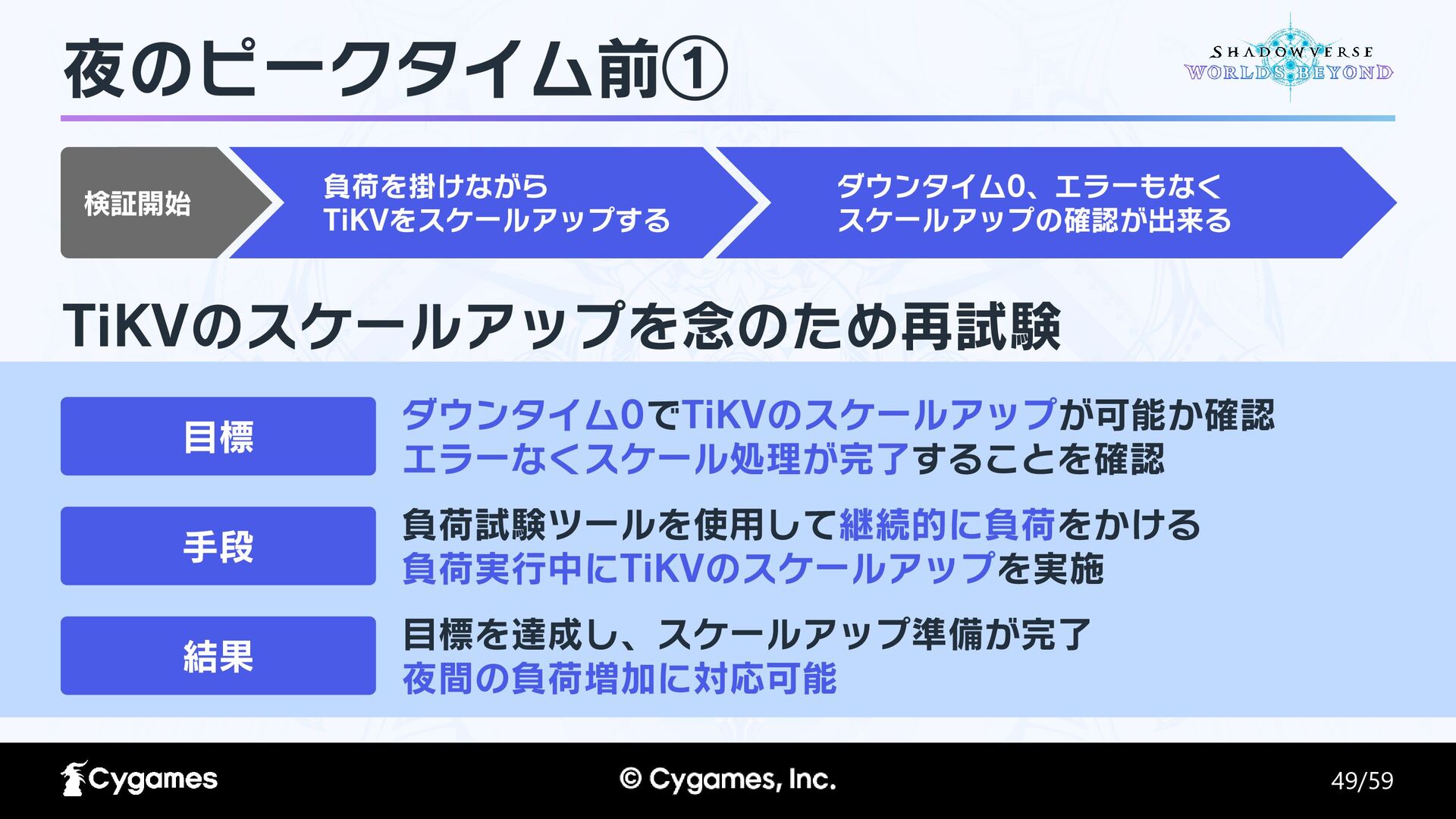 エラーなくスケール処理が完了することを確認 手段 負荷試験ツールを使用して継続的に負荷をかける 負荷実行中にTiKVのスケールアップを実施 結果 目標を達成し、スケールアップ準備が完了 夜間の負荷増加に対応可能