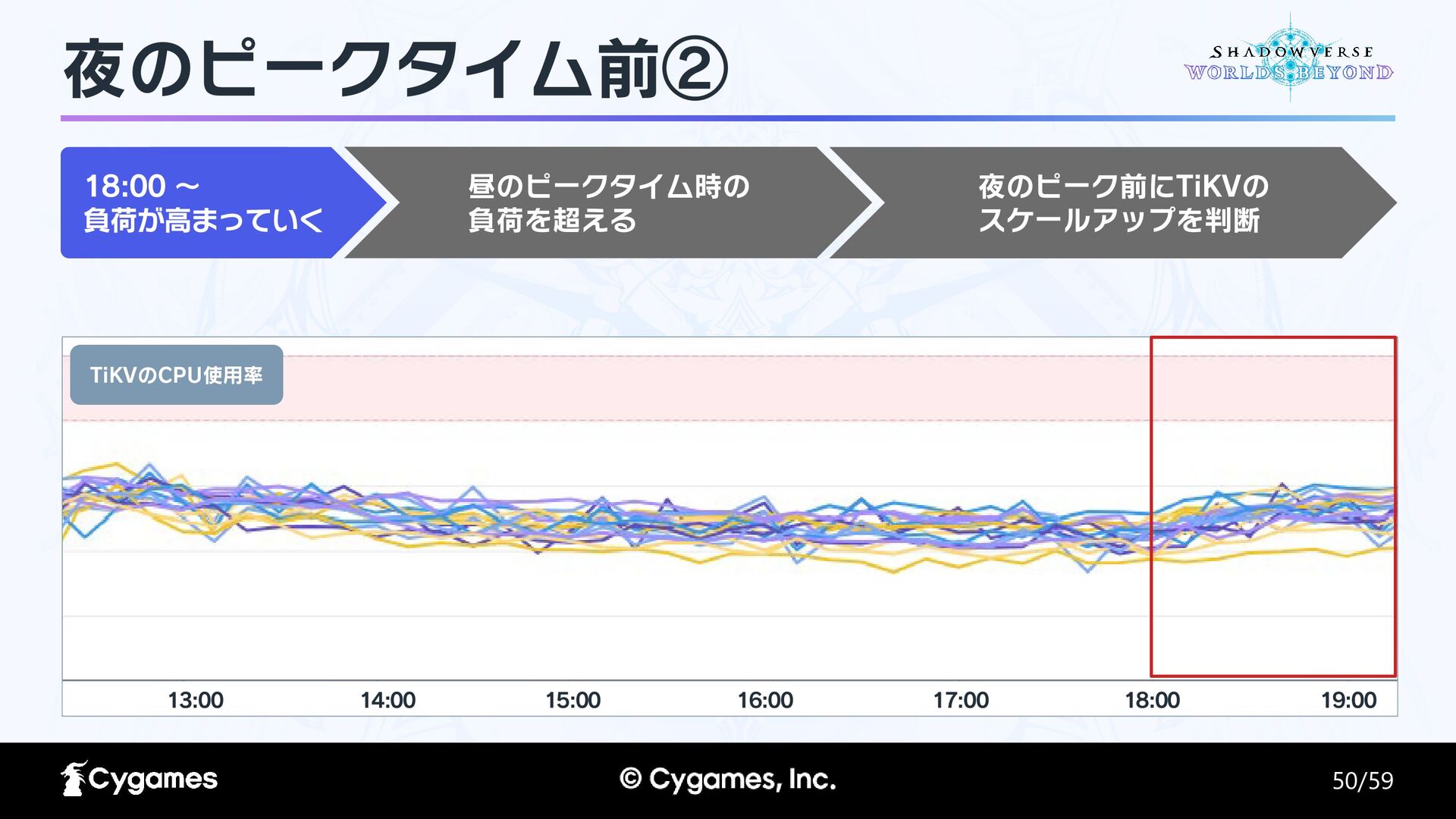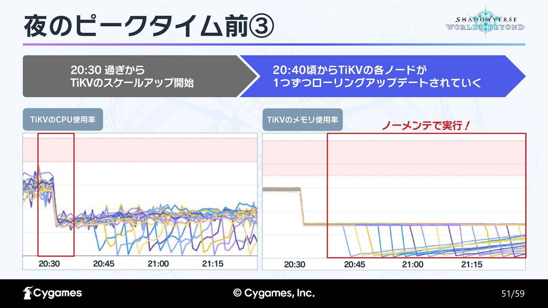 50/59 夜のピークタイム前② 18:00 ~ 負荷が高まっていく 昼のピークタイム時の 負荷を超える 夜のピーク前にTiKVの スケールアップを判断 TiKVのCPU使用率