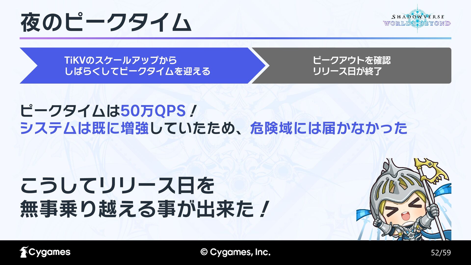 52/59 こうしてリリース日を 無事乗り越える事が出来た! 夜のピークタイム ピークタイムは50万QPS! システムは既に増強していたため、危険域には届かなかった TiKVのスケールアップから しばらくしてピークタイムを迎える ピークアウトを確認 リリース日が終了