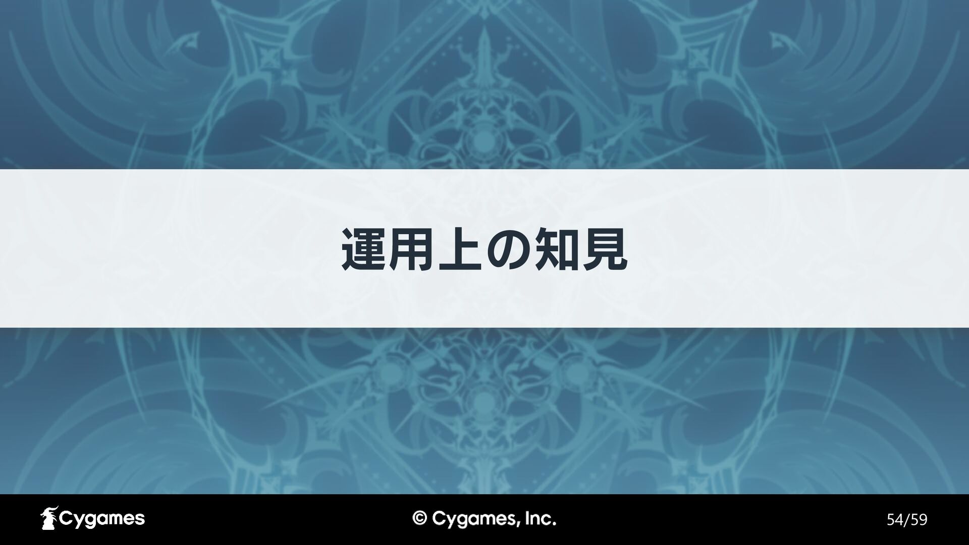 53/59 リリース(まとめ) ノーメンテのシステムスケールで 最高のゲーム体験を提供! 期待以上の反響でリリース告知時間からアクセスが急増 急激な負荷にもAPIサーバーと TiDBのスケールアウトで ノーメンテ対応! 夜のピークタイムに向けて TiKVのスケールアップで