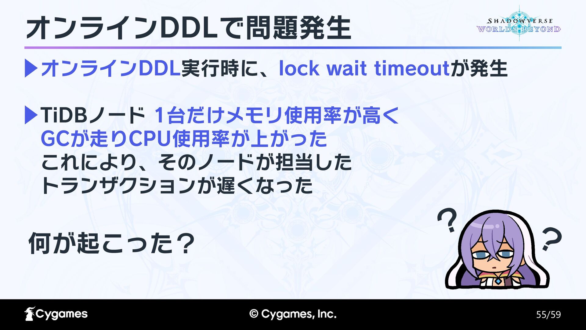 55/59 オンラインDDLで問題発生 オンラインDDL実行時に、lock wait timeoutが発生 TiDBノード 1台だけメモリ使用率が高く GCが走りCPU使用率が上がった これにより、そのノードが担当した トランザクションが遅くなった