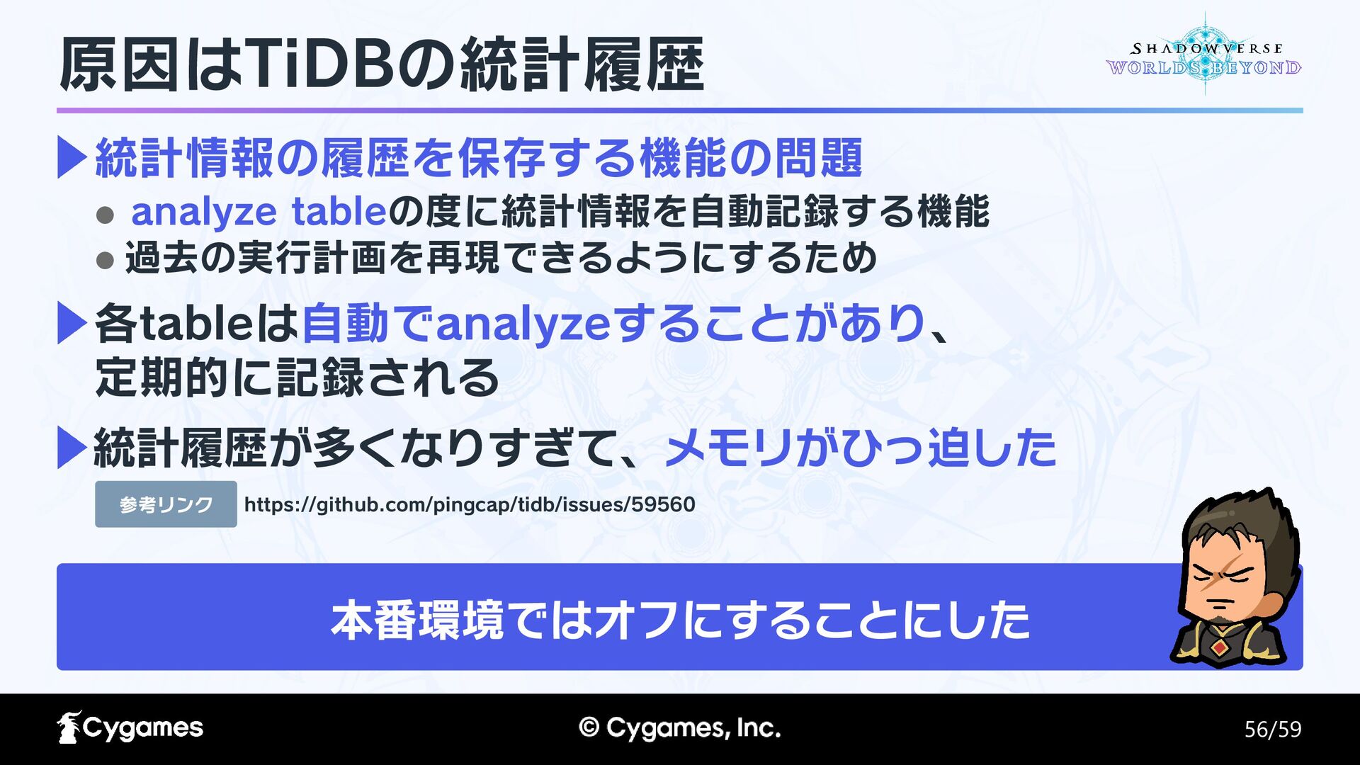56/59 統計情報の履歴を保存する機能の問題 analyze tableの度に統計情報を自動記録する機能 過去の実行計画を再現できるようにするため 各tableは自動でanalyzeすることがあり、 定期的に記録される 統計履歴が多くなりすぎて、メモリがひっ迫した 本番環境ではオフにすることにした 原因はTiDBの統計履歴