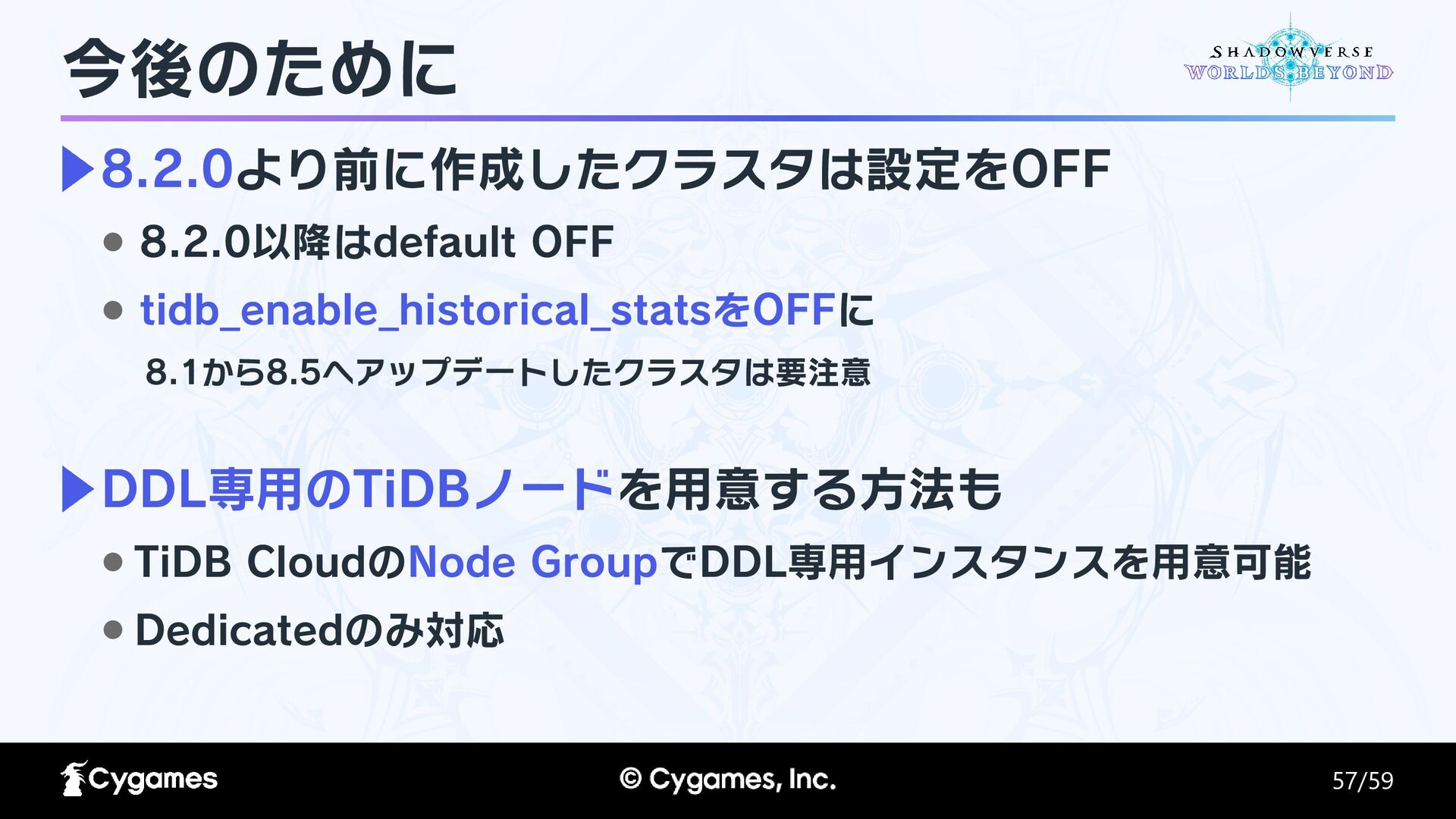 57/59 今後のために 8.2.0より前に作成したクラスタは設定をOFF 8.2.0以降はdefault OFF tidb_enable_historical_statsをOFFに 8.1から8.5へアップデートしたクラスタは要注意 DDL専用のTiDBノードを用意する方法も TiDB CloudのNode