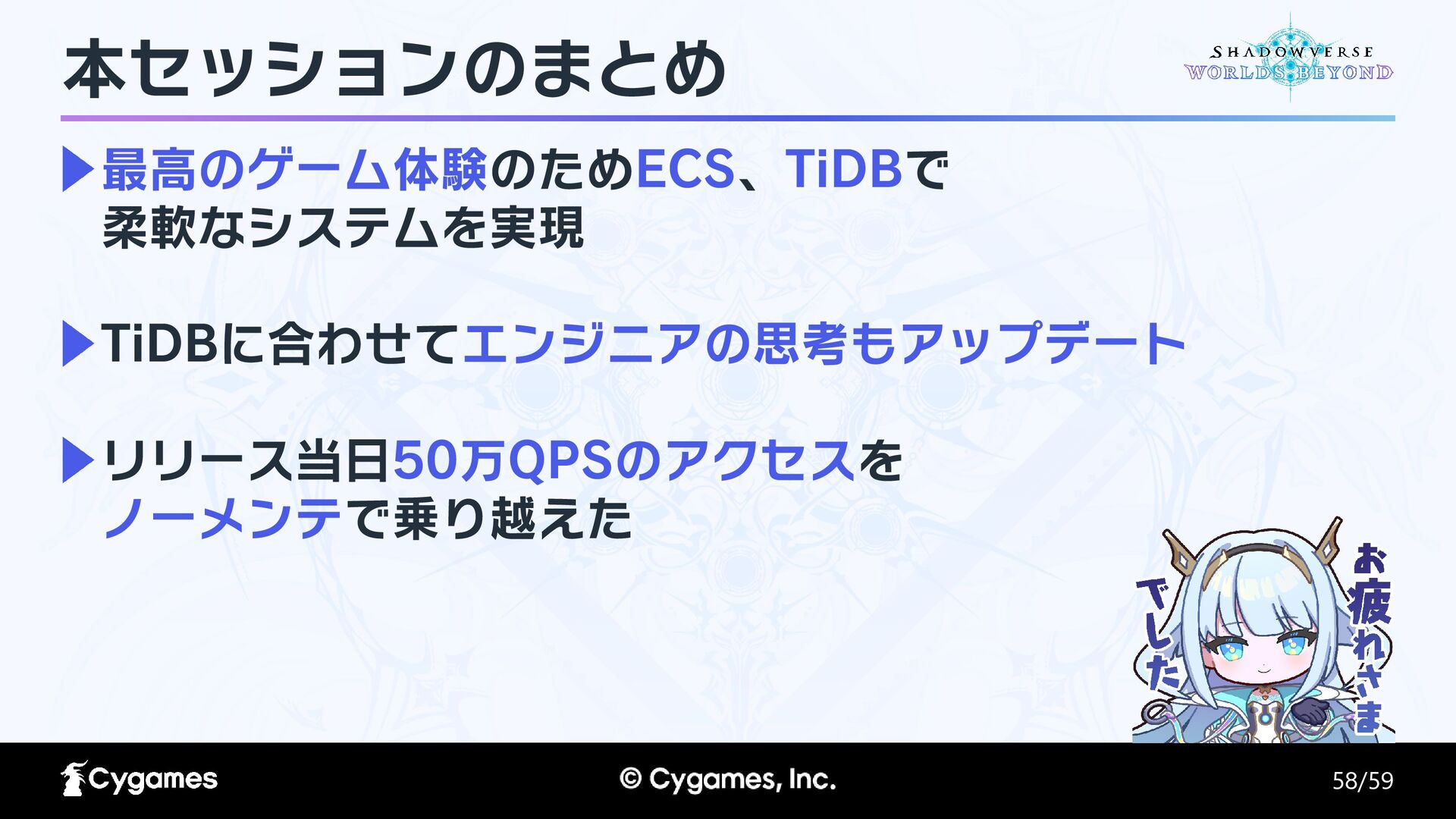 58/59 本セッションのまとめ 最高のゲーム体験のためECS、TiDBで 柔軟なシステムを実現 TiDBに合わせてエンジニアの思考もアップデート リリース当日50万QPSのアクセスを ノーメンテで乗り越えた