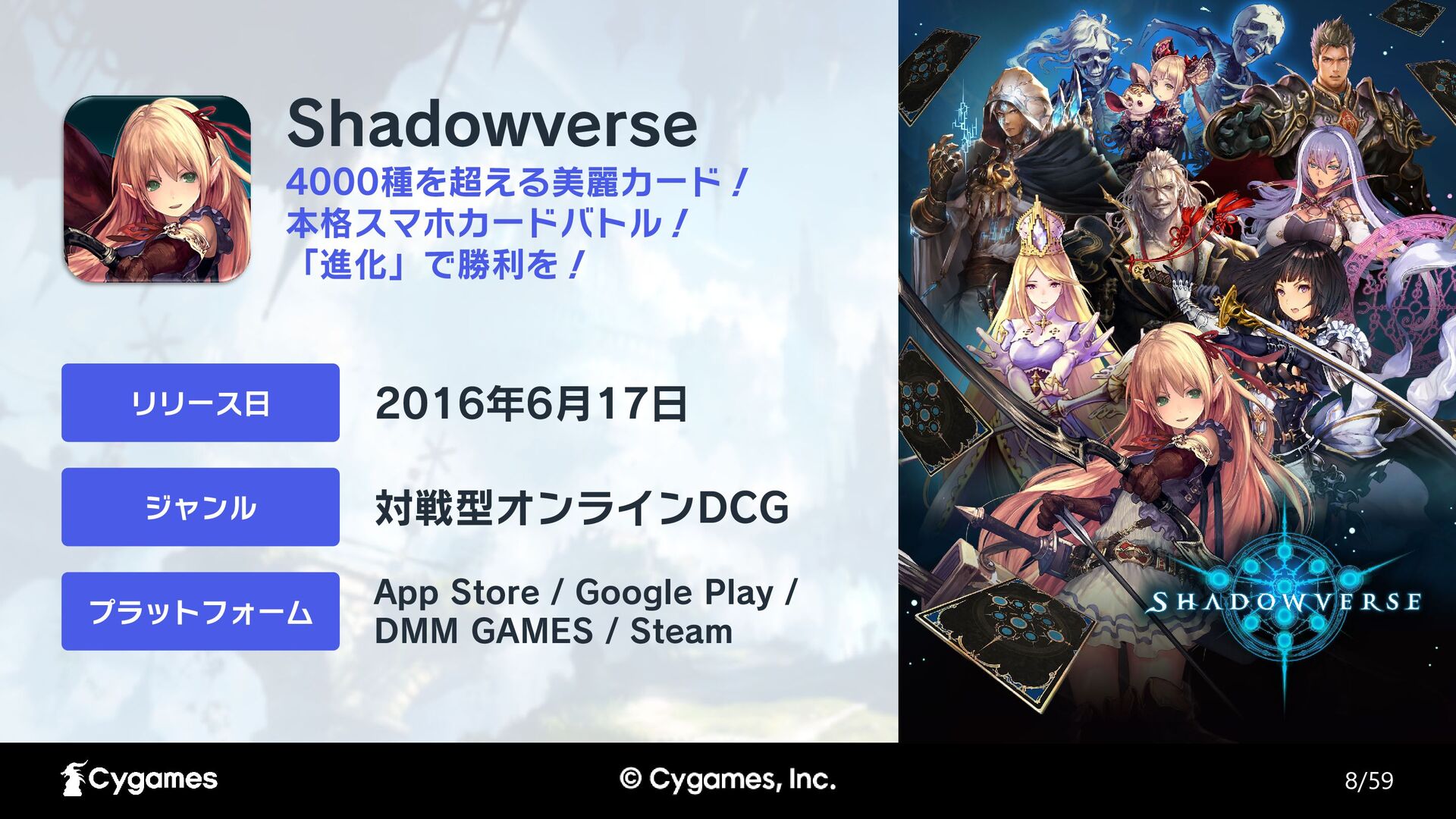 8/59 Shadowverse 4000種を超える美麗カード! 本格スマホカードバトル! 「進化」で勝利を! 2016年6月17日 対戦型オンラインDCG App Store /