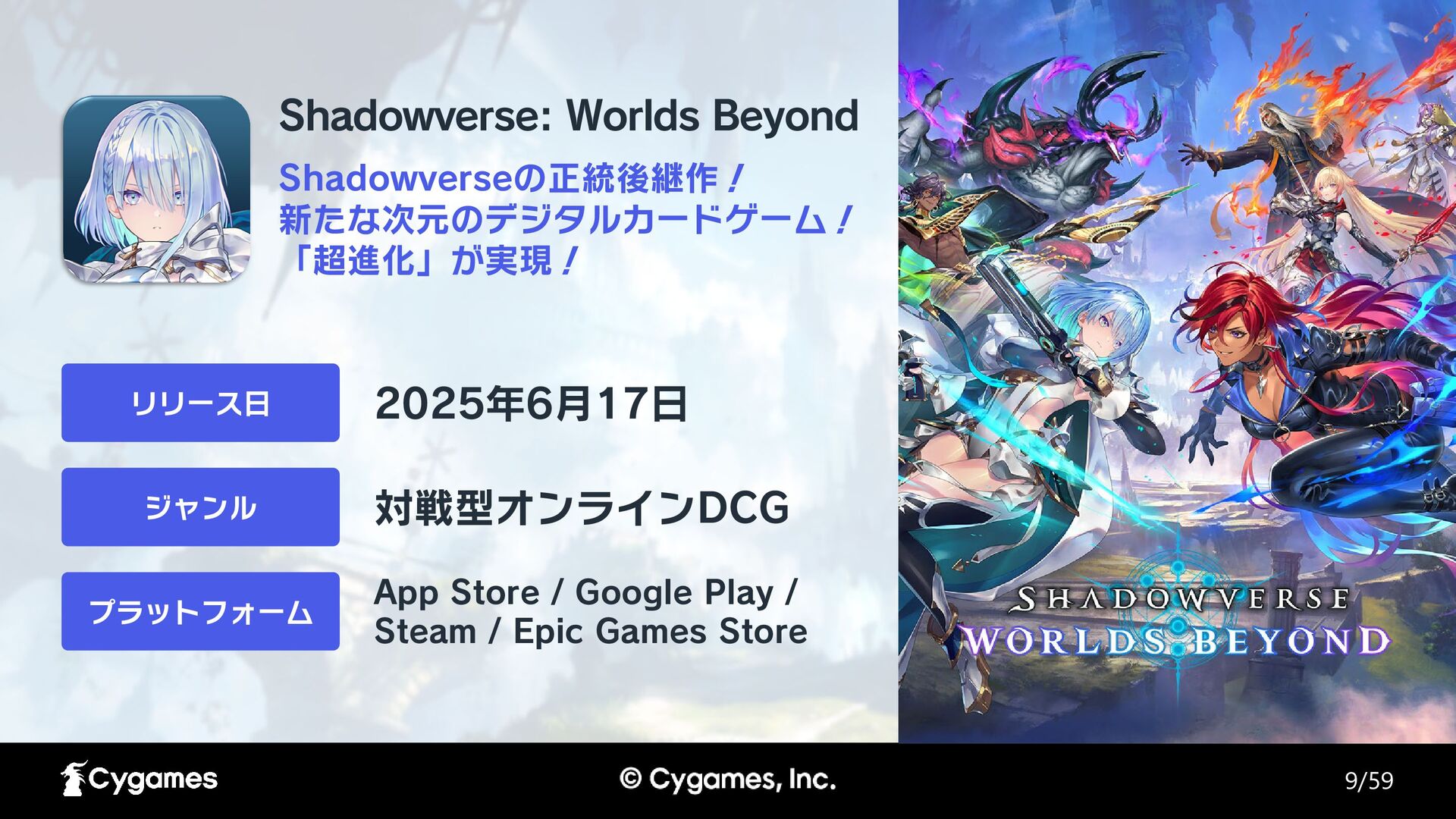 9/59 Shadowverse: Worlds Beyond Shadowverseの正統後継作! 新たな次元のデジタルカードゲーム! 「超進化」が実現! リリース日 ジャンル プラットフォーム