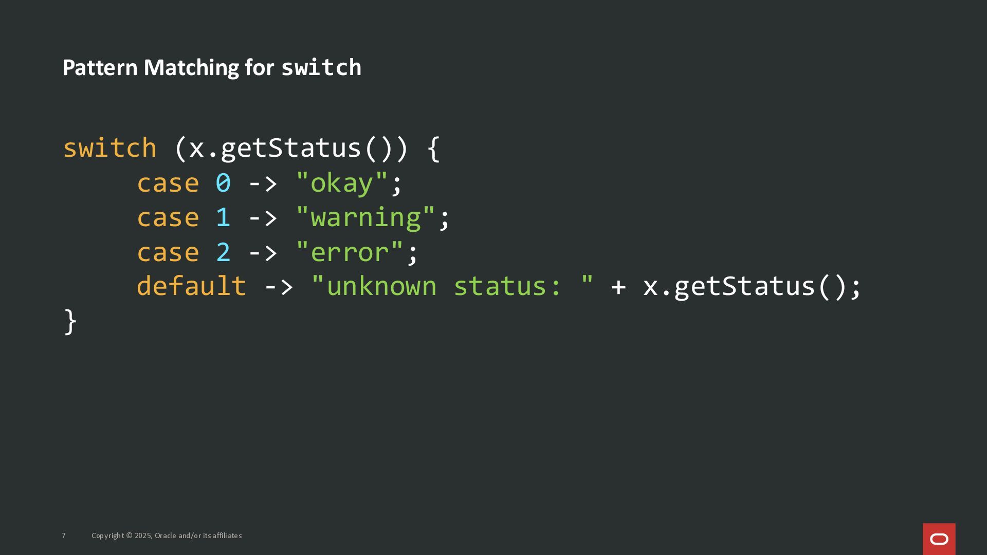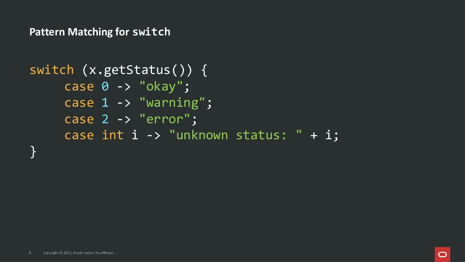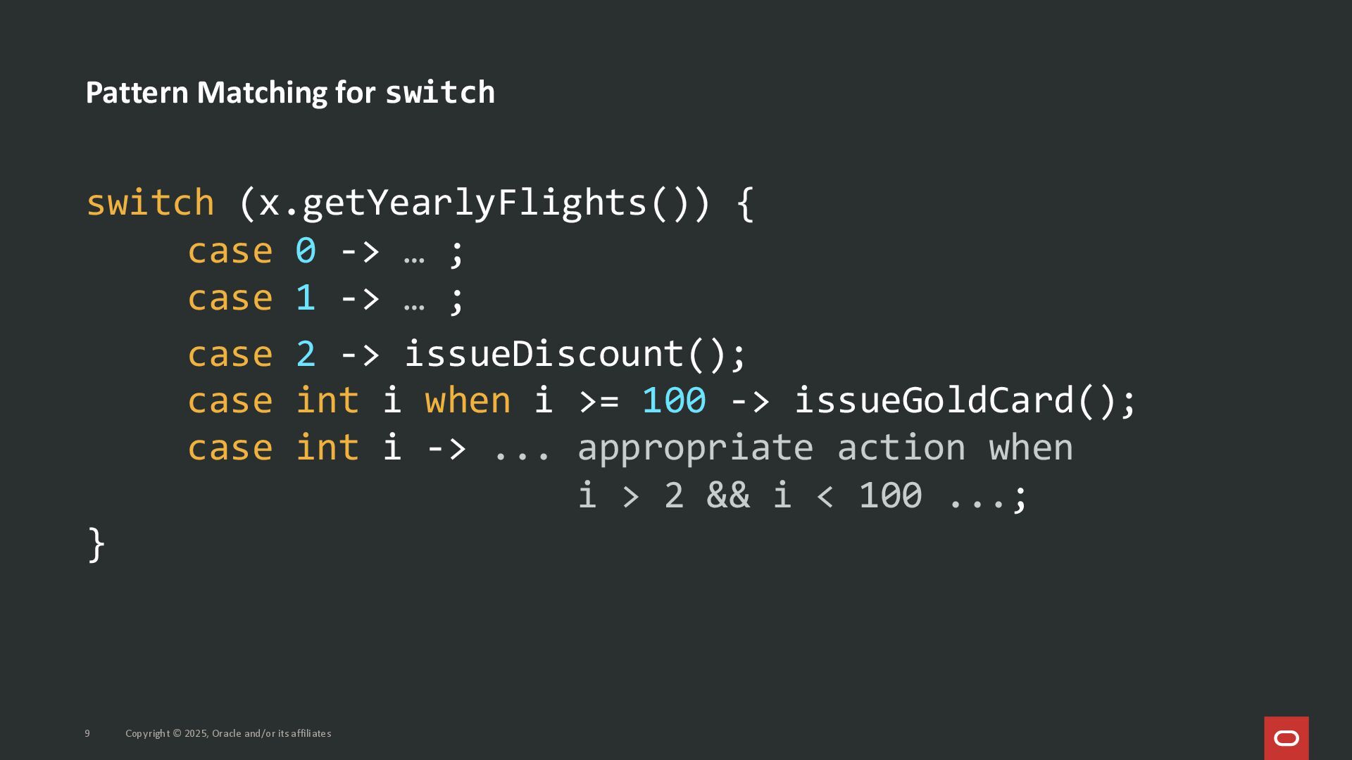 its affiliates switch (x.getYearlyFlights()) { case 0 -> … ; case 1 -> … ; case 2 -> issueDiscount(); case int i when i >= 100 -> issueGoldCard(); case int i -> ... appropriate action when i > 2 && i < 100 ...; }