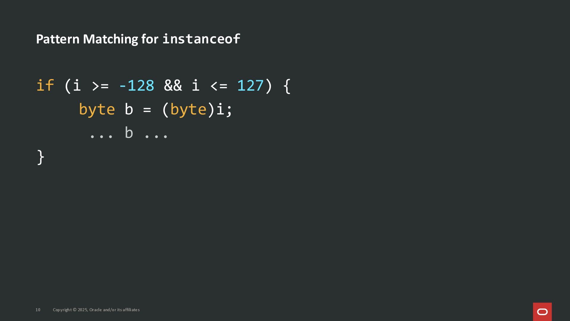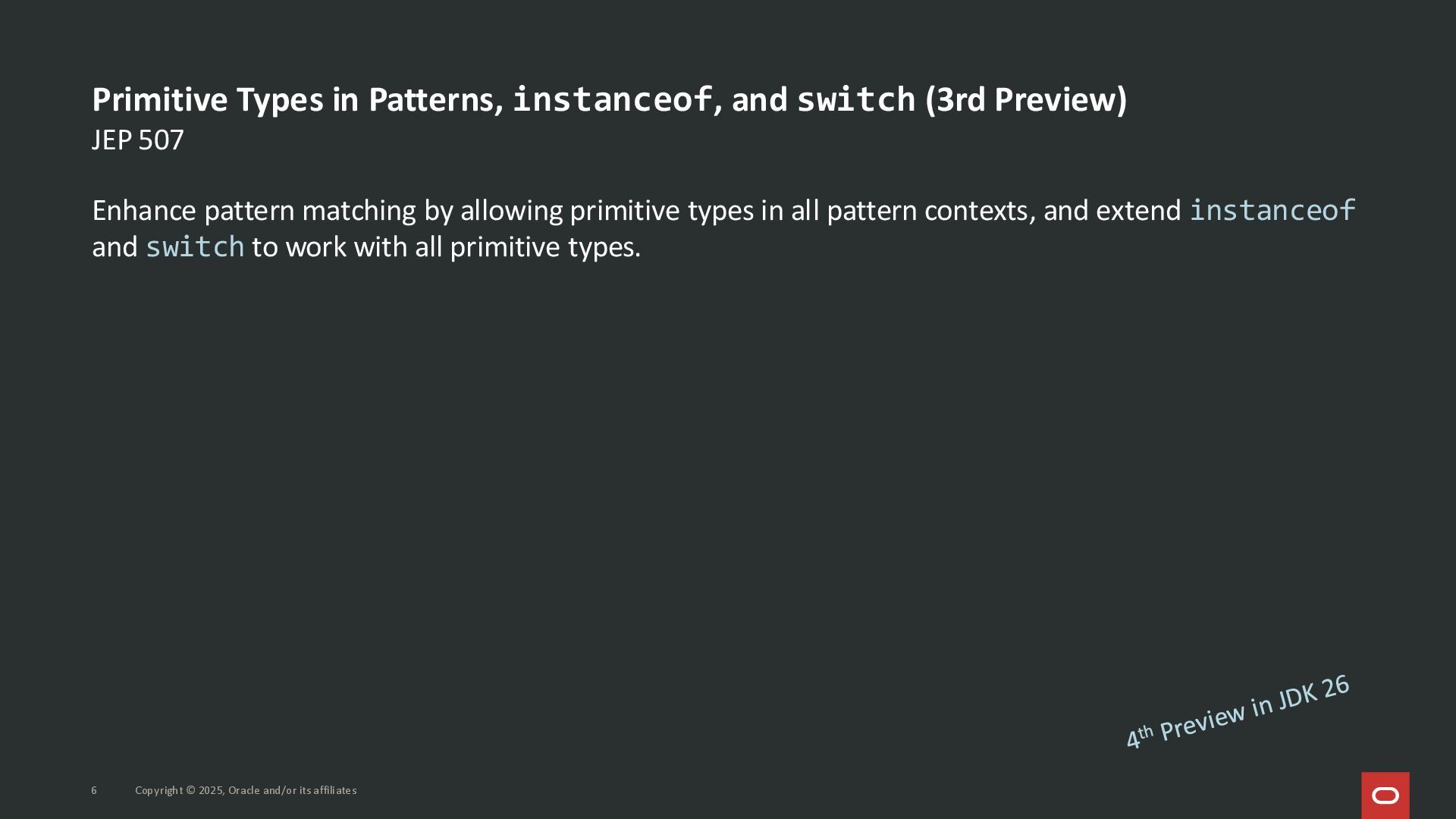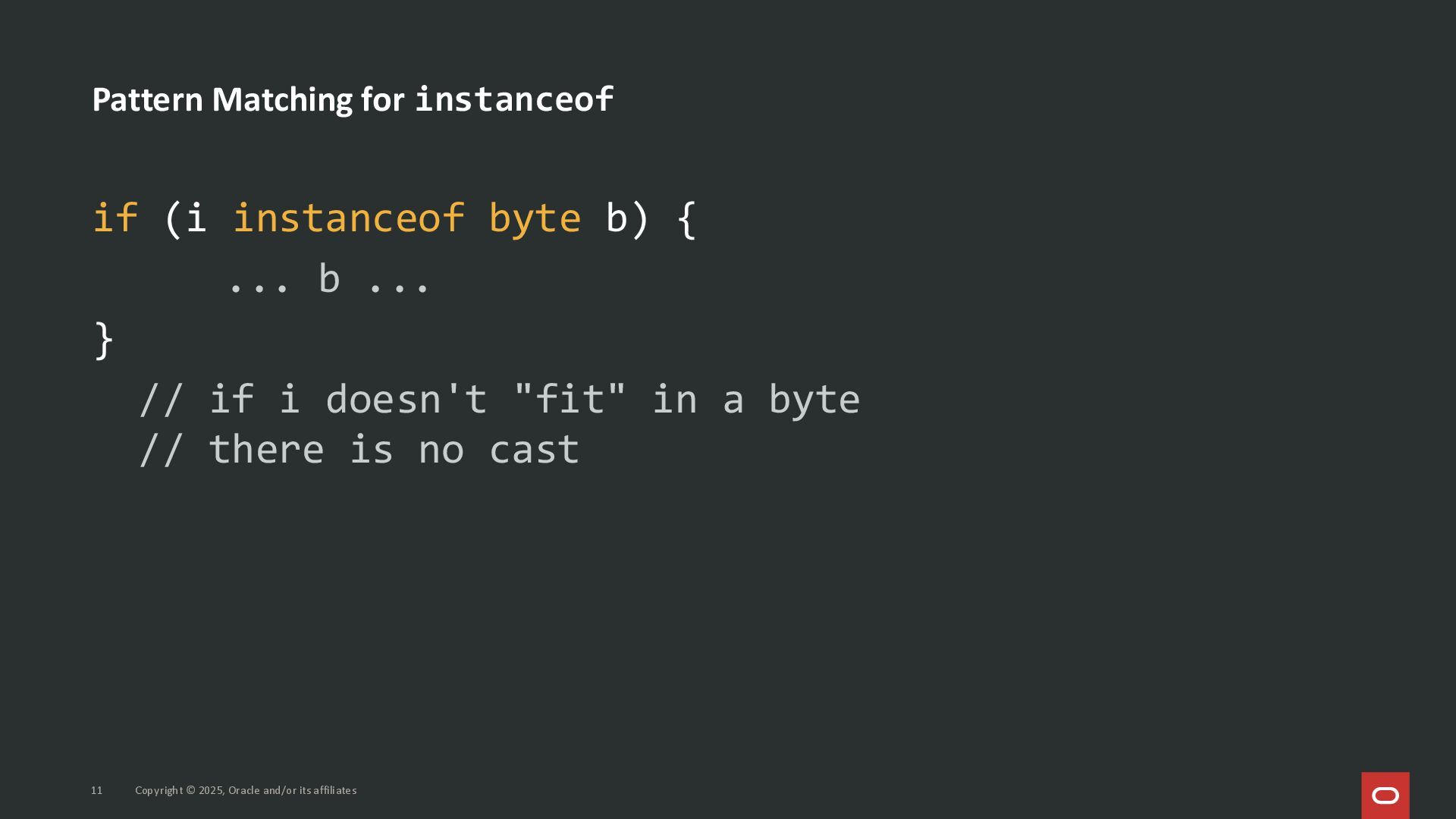 its affiliates switch (x.getYearlyFlights()) { case 0 -> … ; case 1 -> … ; case 2 -> issueDiscount(); case int i when i >= 100 -> issueGoldCard(); case int i -> ... appropriate action when i > 2 && i < 100 ...; }