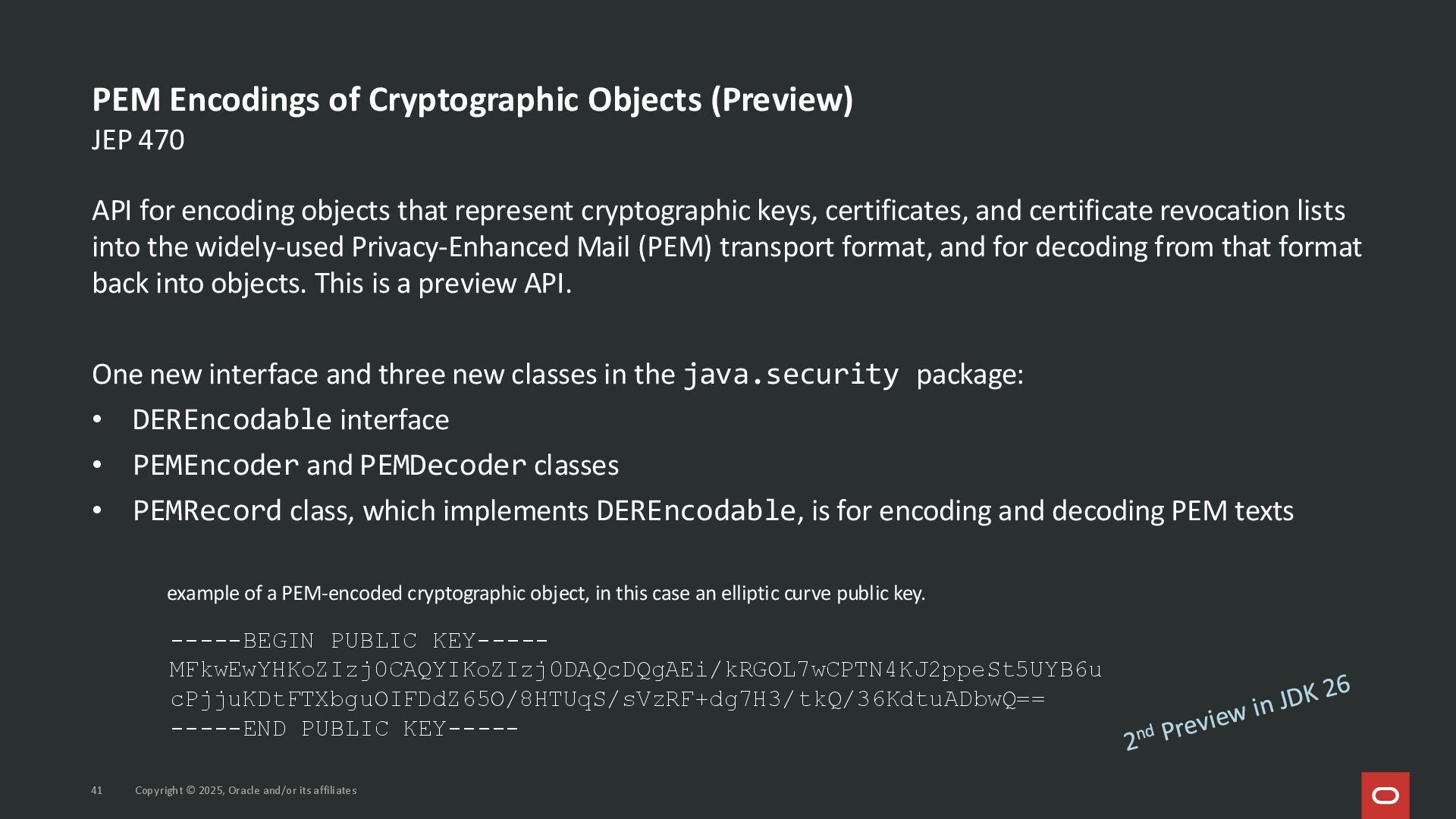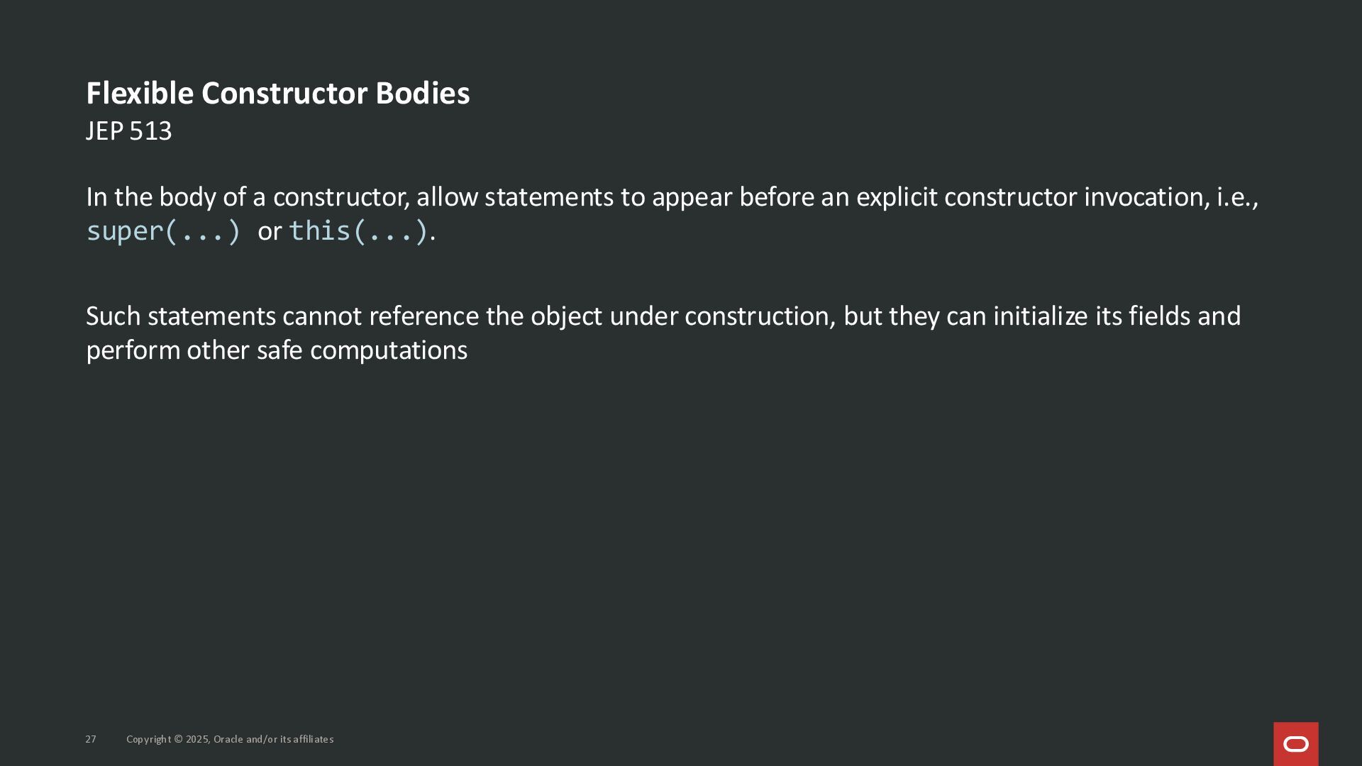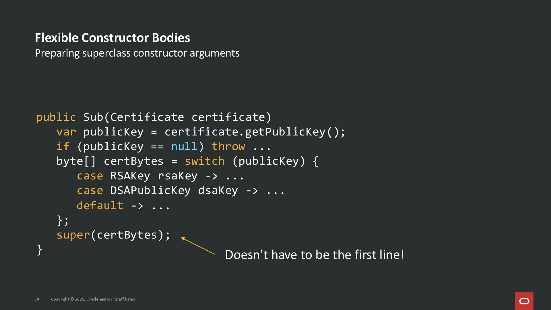 2025, Oracle and/or its affiliates public Sub(Certificate certificate) var publicKey = certificate.getPublicKey(); if (publicKey == null) throw ... byte[] certBytes = switch (publicKey) { case RSAKey rsaKey -> ... case DSAPublicKey dsaKey -> ... default -> ... }; super(certBytes); } Doesn't have to be the first line!