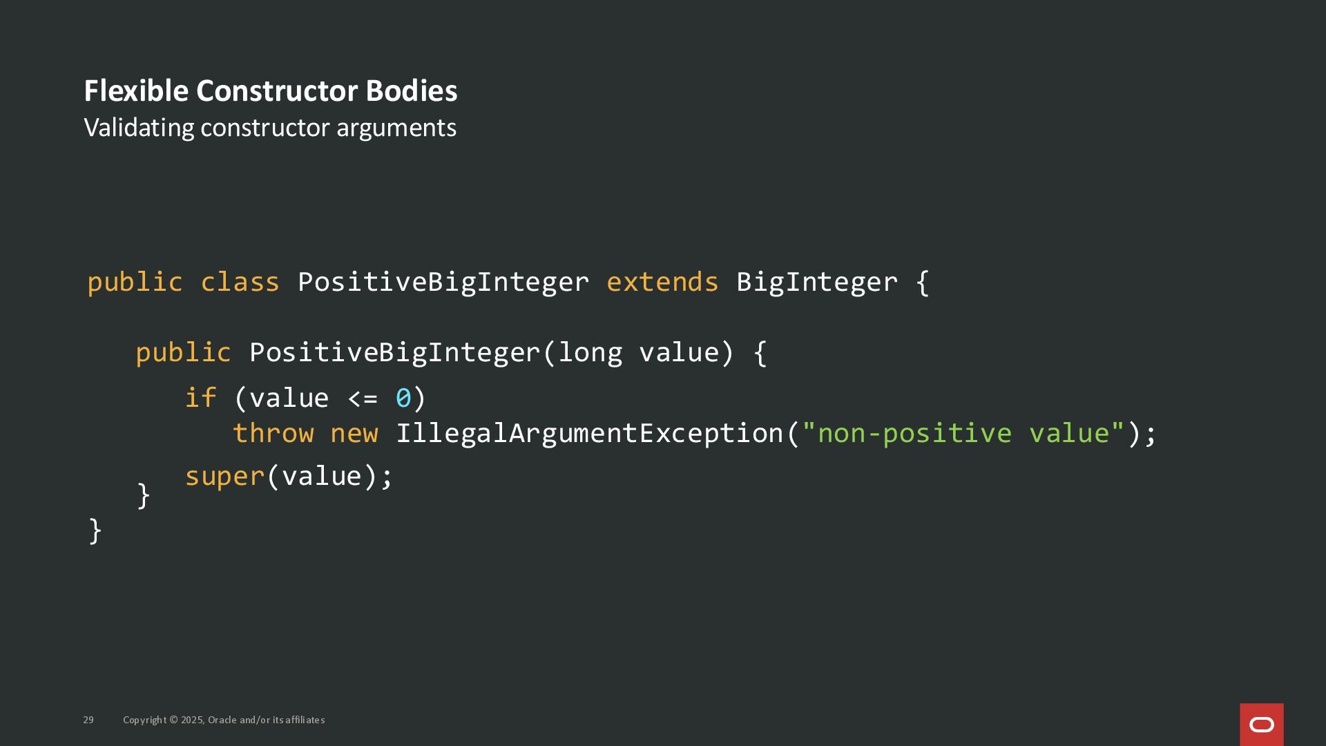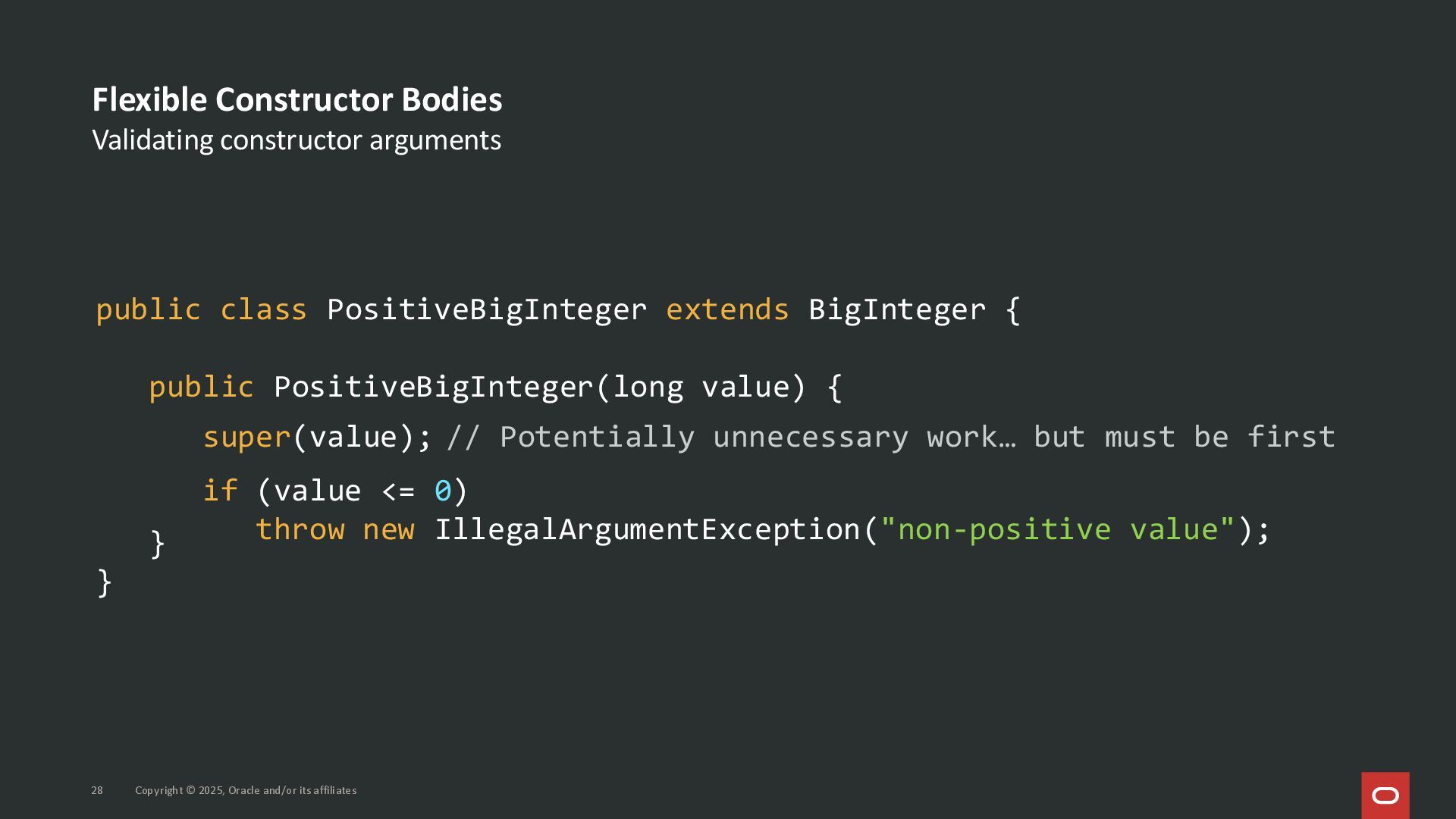 Oracle and/or its affiliates public class PositiveBigInteger extends BigInteger { public PositiveBigInteger(long value) { } } super(value); if (value <= 0) throw new IllegalArgumentException("non-positive value"); // Potentially unnecessary work… but must be first