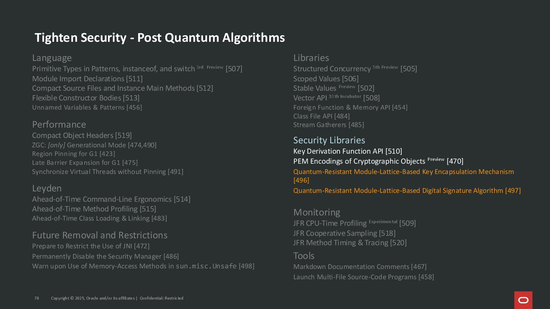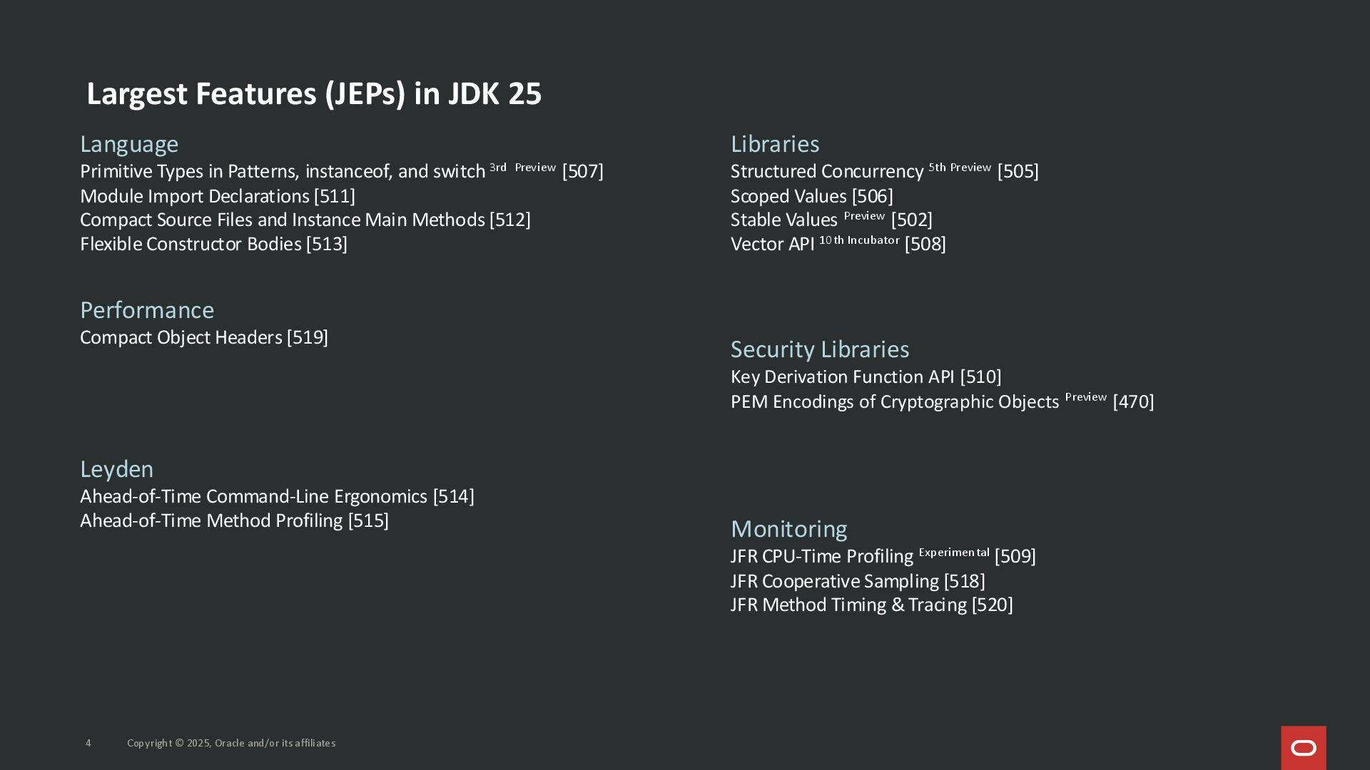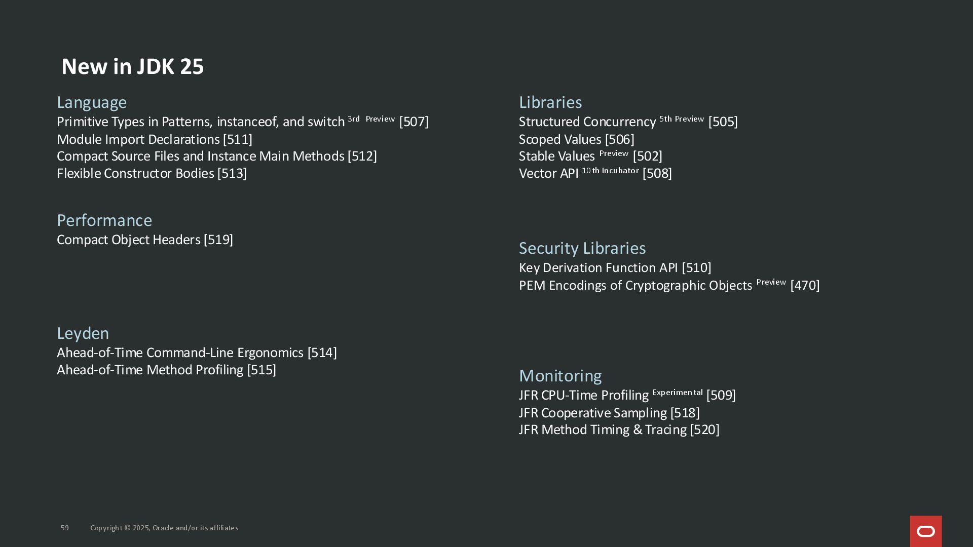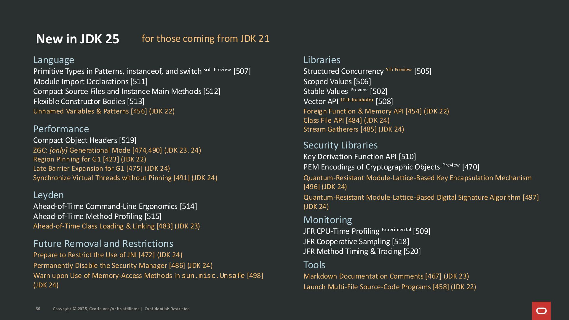 Revisaremos las nuevas características publicadas en el JDK 25, desde mejoras en el lenguaje, pasando por librerías de seguridad, monitoreo y performance.