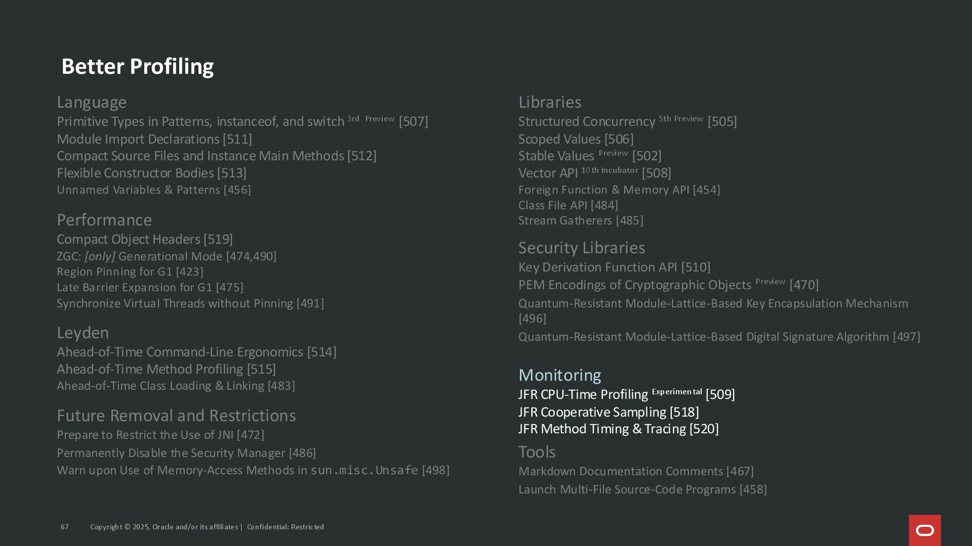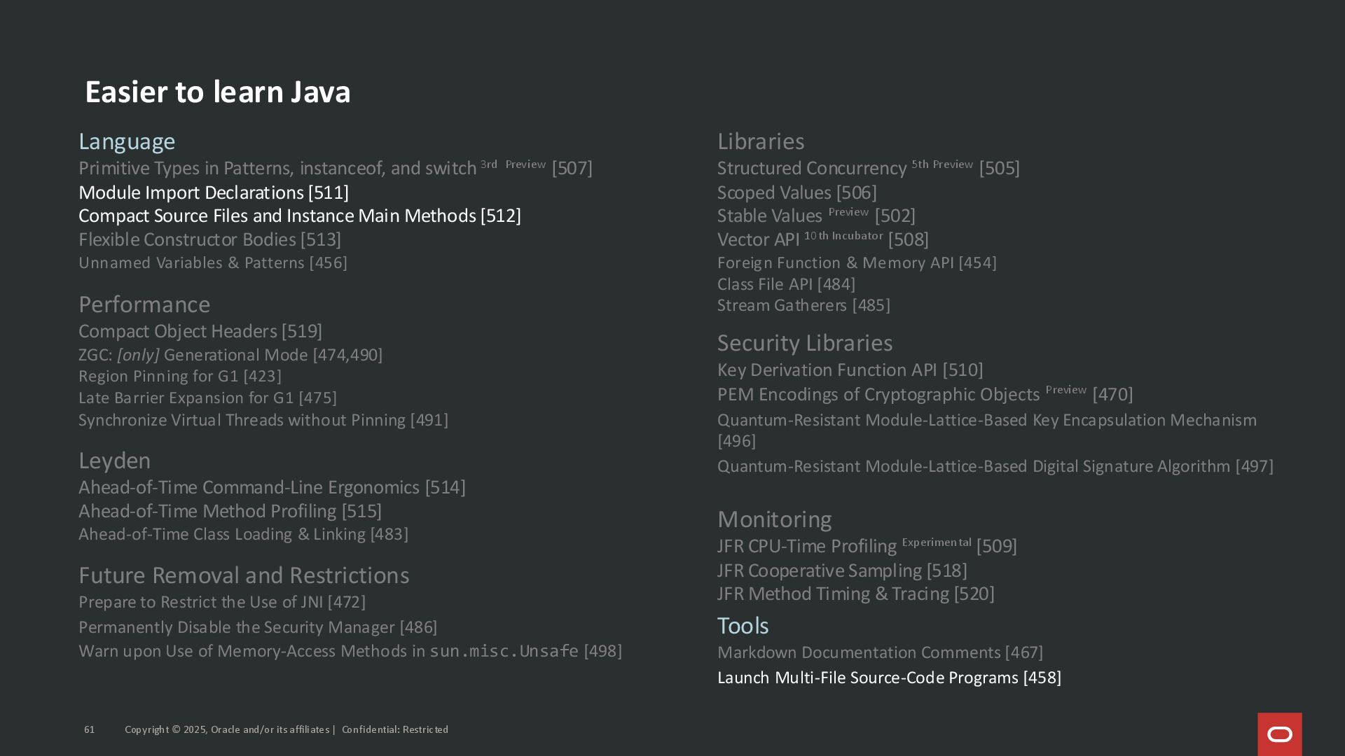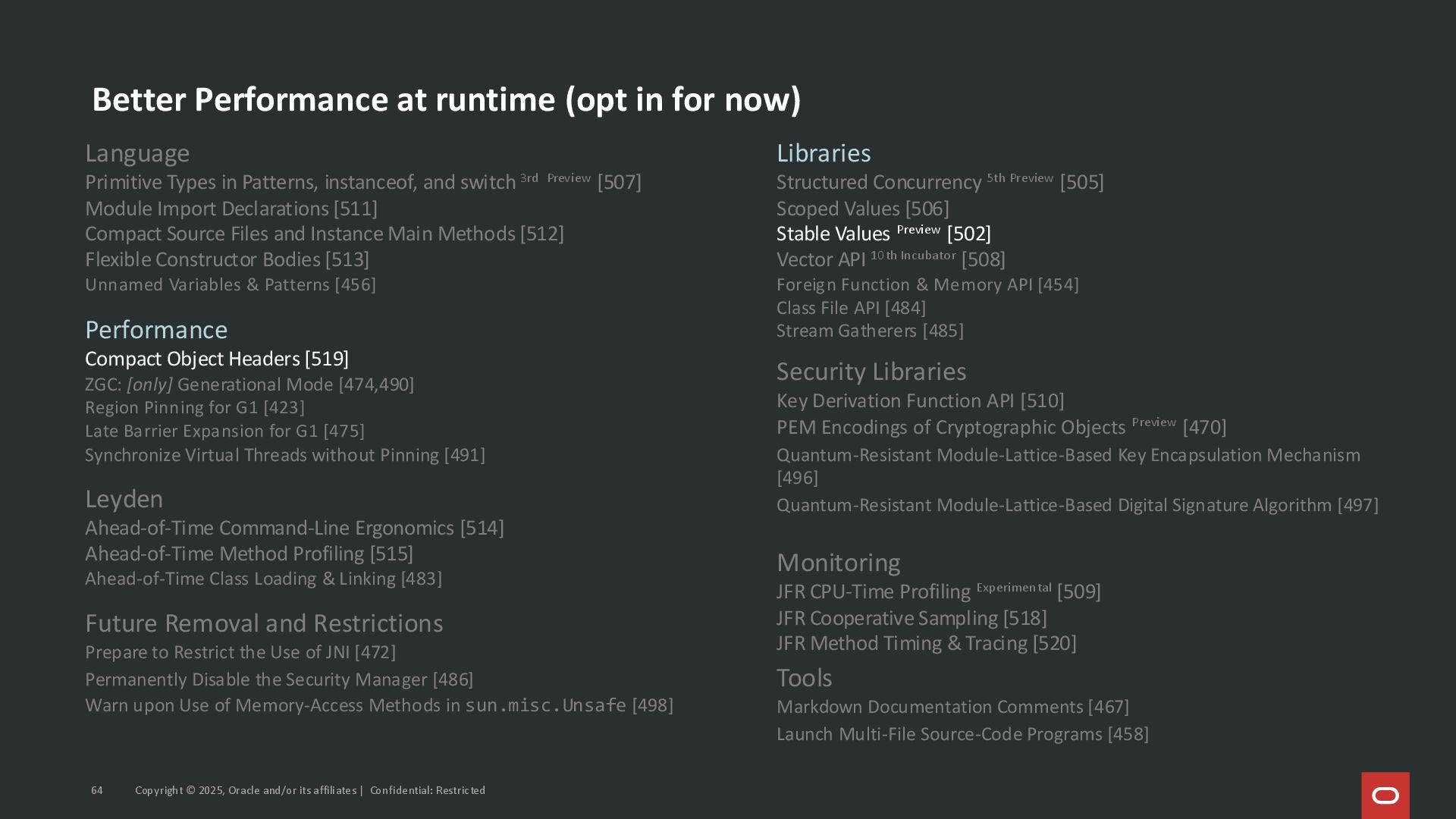 Revisaremos las nuevas características publicadas en el JDK 25, desde mejoras en el lenguaje, pasando por librerías de seguridad, monitoreo y performance.