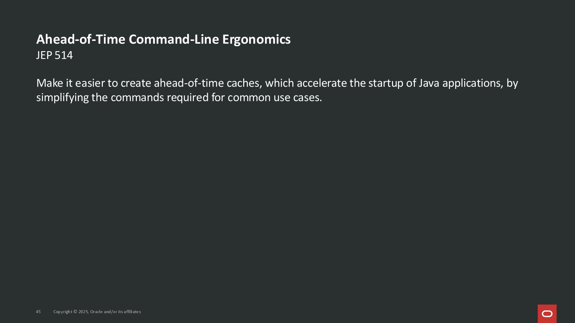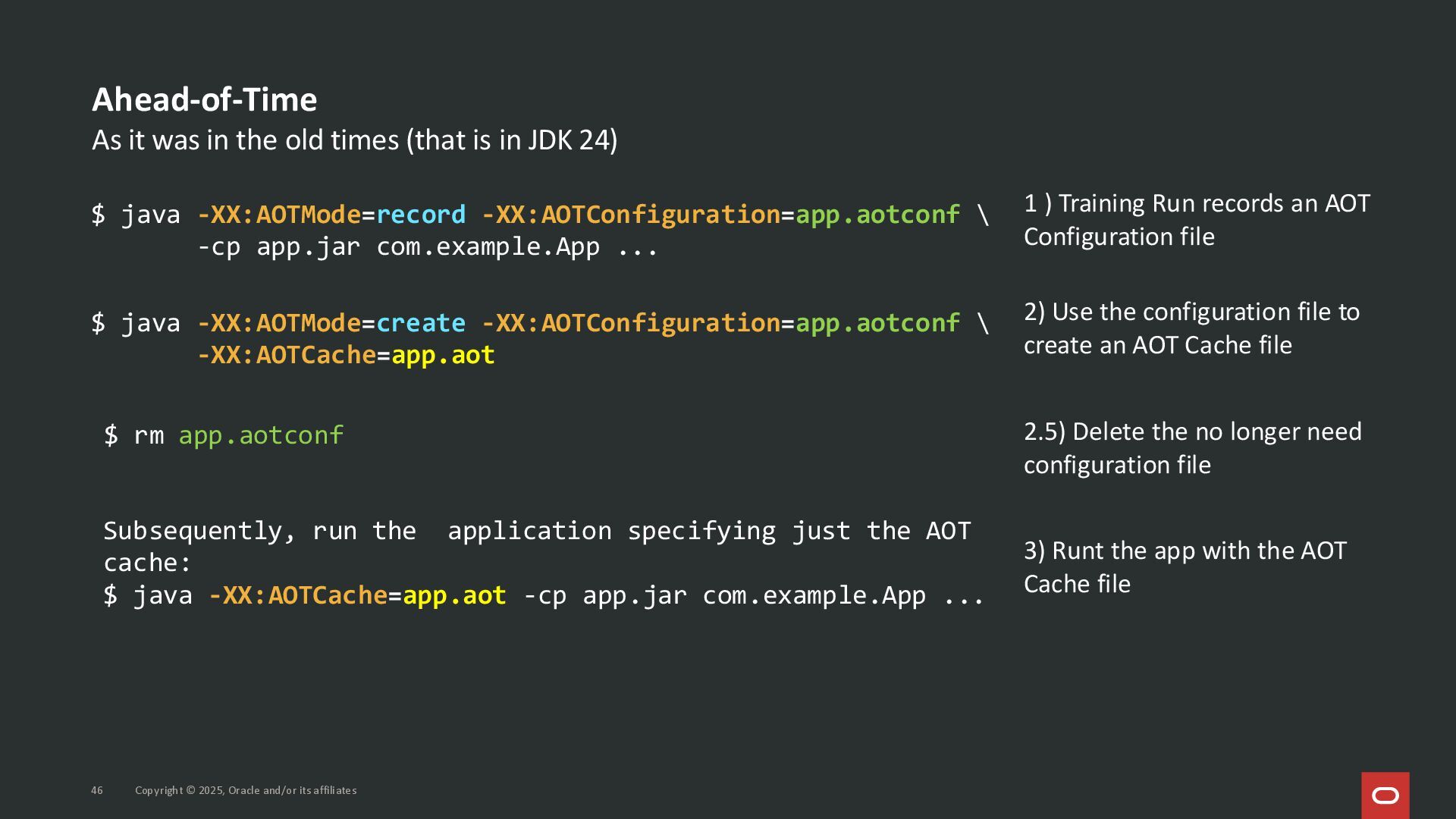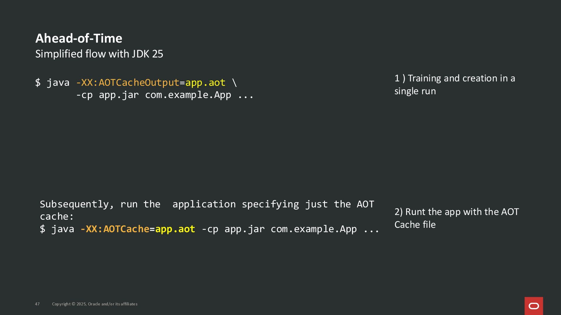 Oracle and/or its affiliates 1 ) Training and creation in a single run 2) Runt the app with the AOT Cache file $ java -XX:AOTCacheOutput=app.aot \ -cp app.jar com.example.App ... Subsequently, run the application specifying just the AOT cache: $ java -XX:AOTCache=app.aot -cp app.jar com.example.App ...