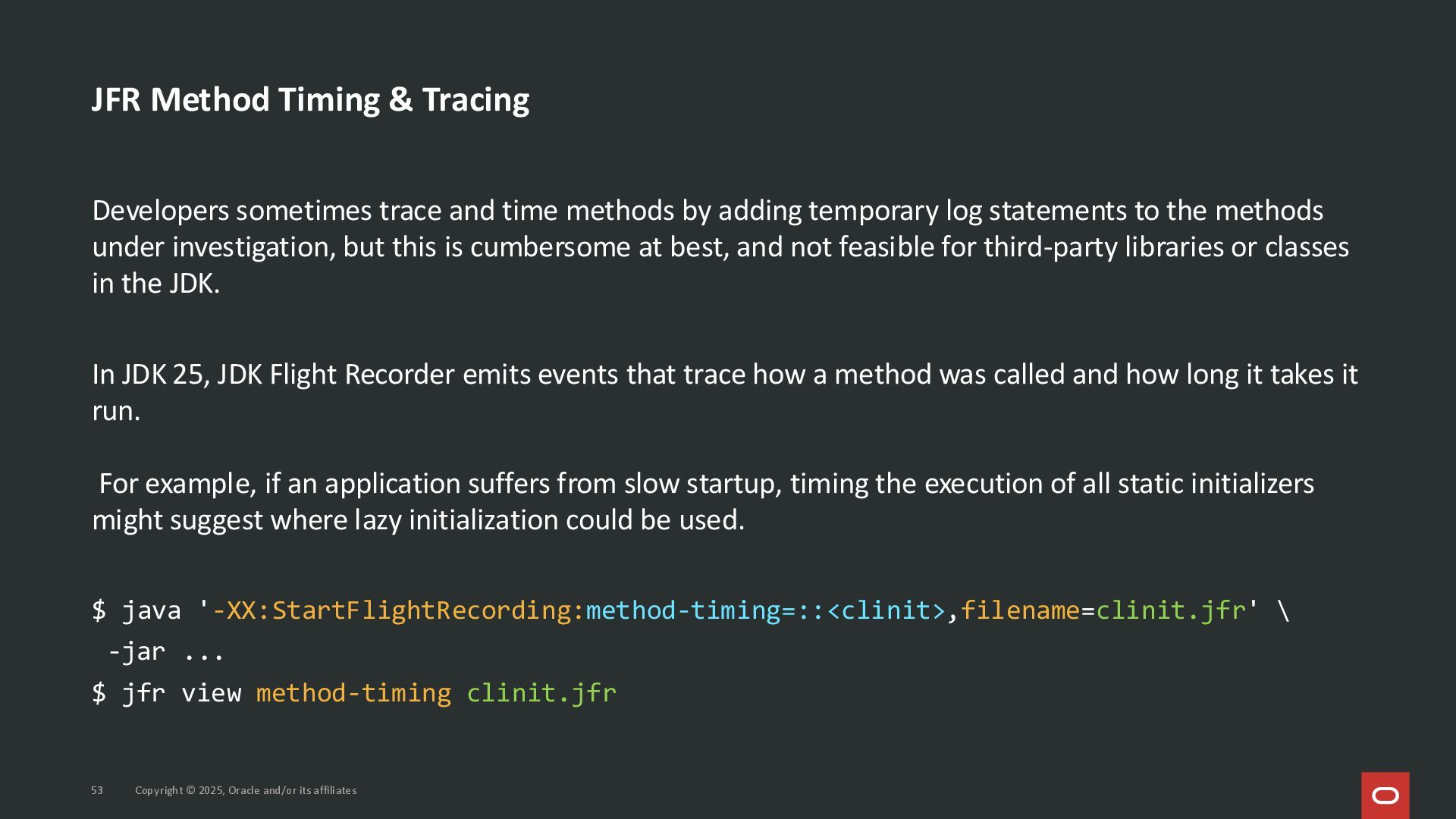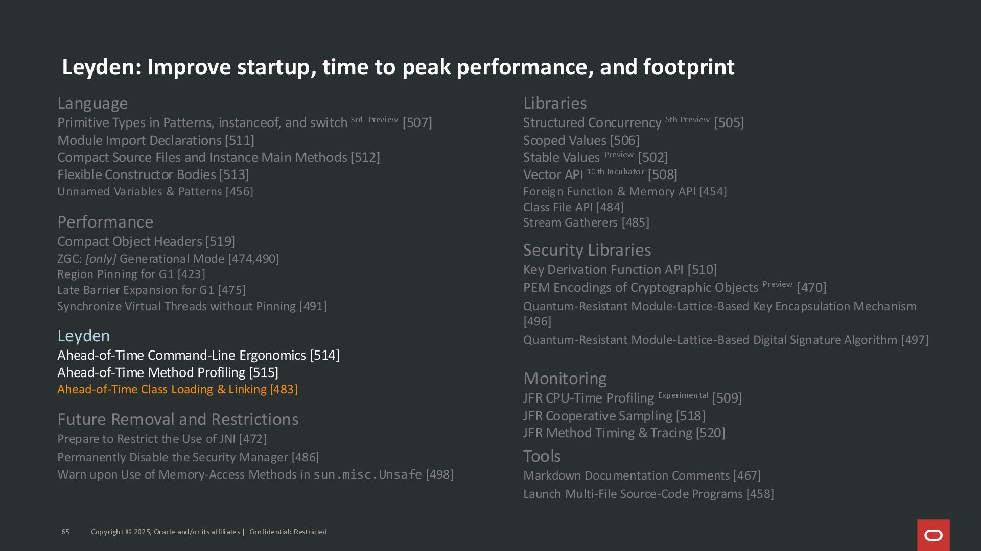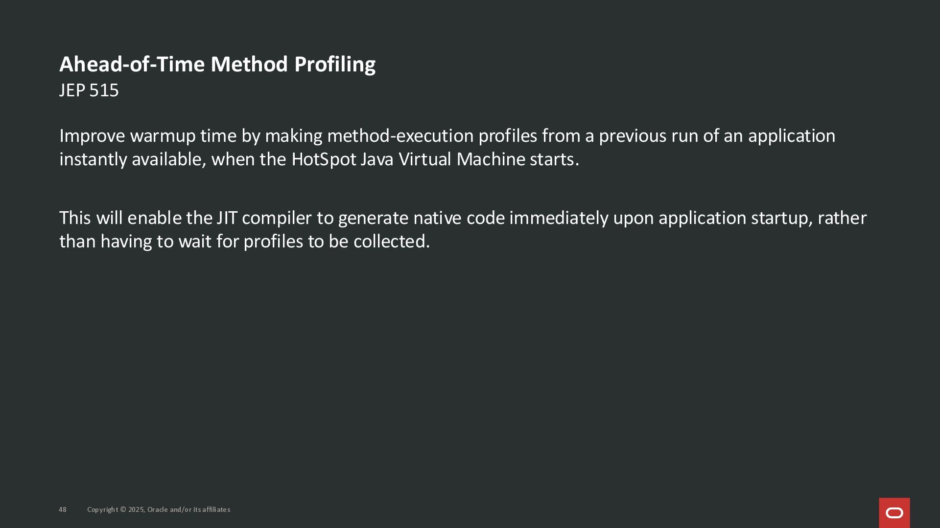 Oracle and/or its affiliates 1 ) Training and creation in a single run 2) Runt the app with the AOT Cache file $ java -XX:AOTCacheOutput=app.aot \ -cp app.jar com.example.App ... Subsequently, run the application specifying just the AOT cache: $ java -XX:AOTCache=app.aot -cp app.jar com.example.App ...