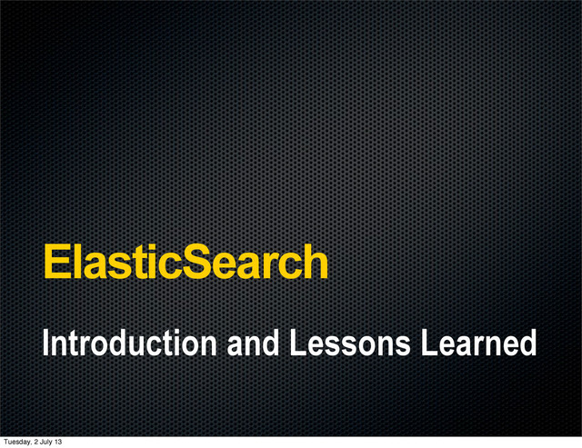 { "title": "ElasticSearch: Introduction." }, "_type": "talk", "_version": 1, "exists": true } Tuesday, 2 July 13