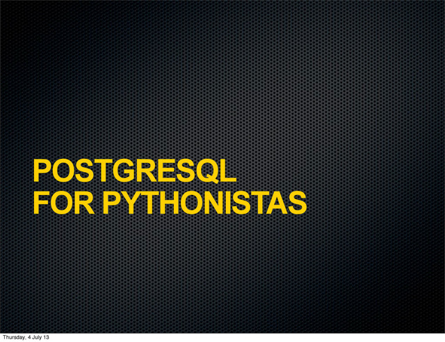 This talk requires no previous experience of PostgreSQL but general experience with a RDMS would be useful.