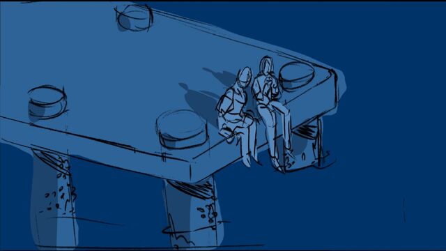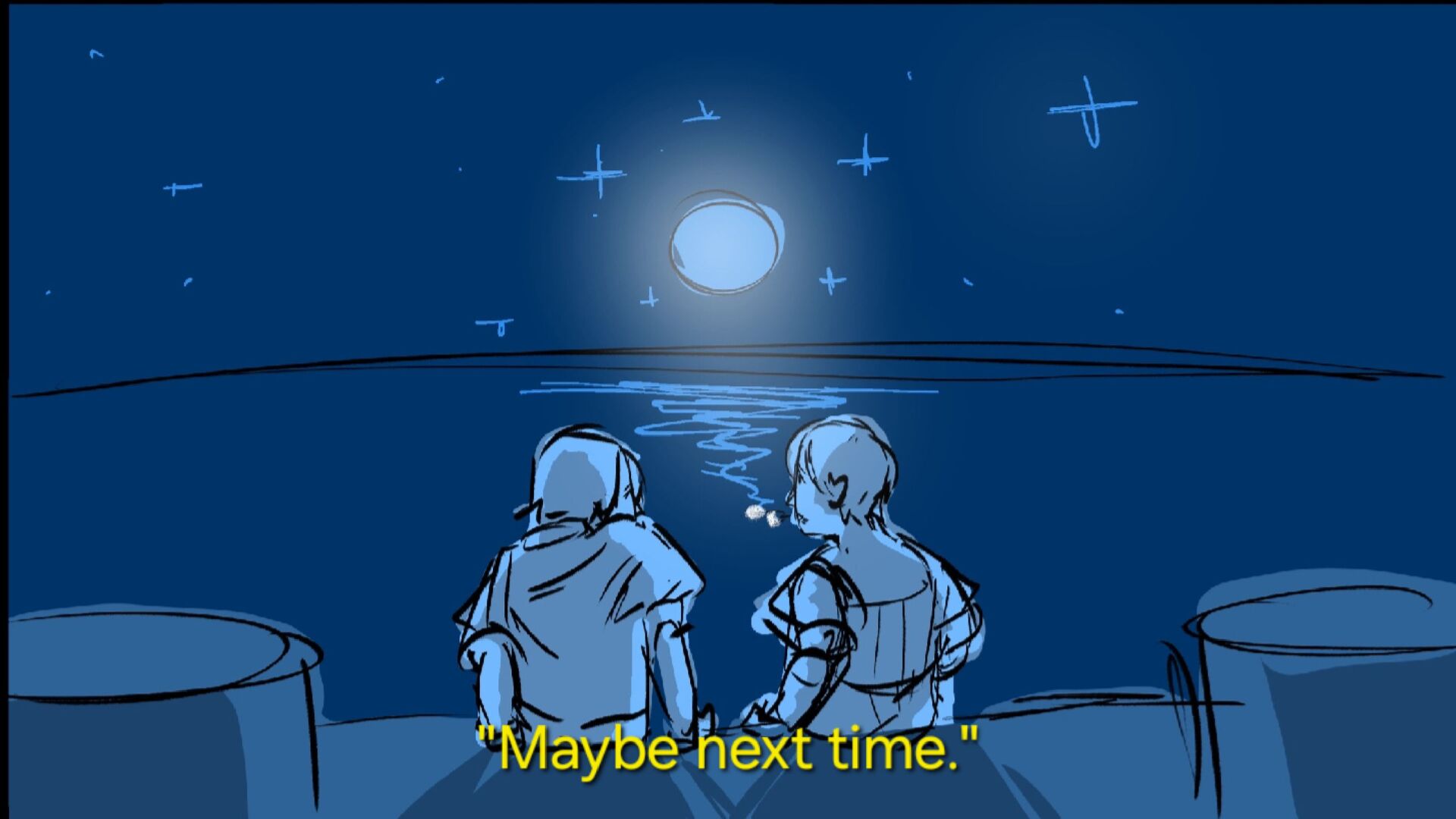 Two troubled pirate lovers share a private moment on a dock.