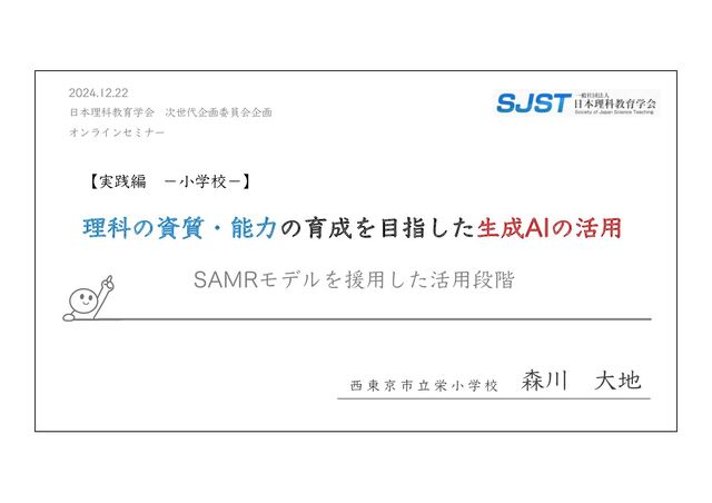 https://www.mext.go.jp/content/20241126- mxt_jogai01-000038813_001.pdf (accessed 2024.12.16) ⽂部科学省(2024b)「初等中等教育段階における⽣成AIの利活⽤に関するガイドライン(案)」Retrieved from https://www.mext.go.jp/content/20241220- mxt_jogai01-000039176_001.pdf (accessed 2024.12.22) 三井⼀希(2014)「SAMRモデルを⽤いた初等教育におけるICT活⽤実践の分類」⽇本教育⼯学会2014年度第1回研究会予稿集,14(2), 37-40. 三井⼀希・⼾⽥真志・松葉⿓⼀・鈴⽊克明(2020)「⼩学校におけるタブレット端末を活⽤した授業実践のSAMRモデルを⽤いた分析」『教育システム情報学会 誌』Vol37,No.4,pp.348-353. 森川⼤地(2022)「探究可能な問いを⾒いだす実践 ー「変数を⾒いだす⼒」に着⽬してー」初等理科教育会報電⼦版12/1⽉号, 36-39. 森川⼤地(2024)「第3章 ⽣成AIを取り⼊れた理科授業 第1節 ⽐較を通して問題を⾒いだす」中村⼤輝編『⽣成AIで進化する理科教育ー導⼊から実践までの完 全ガイドー』東洋館出版社,40-45. 森川⼤地・⽯⾶幹晴・中村⼤輝(2022)「問題事象から変数を⾒いだす⼒の評価⽅法の開発」『理科教育学研究』, 第63巻, 第1号, 61-69. 森川⼤地・中村⼤輝(2024a)「問いの設定場⾯における「変数を⾒いだす⼒」の育成⽅法の開発」『理科教育学研究』, 第64巻, 第3号, 329-339. 森川⼤地・中村⼤輝(2024b)「⽣成AIを活⽤した問いの⾒いだしの指導法の提案」⽇本理科教育学会第74回全国⼤会,482. NHK 『WEBニュース』https://www3.nhk.or.jp/news/html/20240516/k10014449531000.html(閲覧:2024.12.13) Ruben R. Puentedura (2006)Transformation, Technology, and Education. Retrieved from http://hippasus.com/resources/tte/ (閲覧日2024.12.16) Tamar Shamir Inbal, Liron Levi , Ina Blau(2024)The use of artificial intelligence to promote changes in teaching and learning processes. EDULEARN24 Proceedings, 16th International Conference on Education and New Learning Technologies, 142-145.