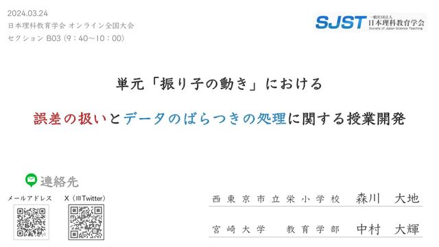 (2001). The development of first year physics students' ideas about measurement in terms of point and set paradigms. International Journal of Science Education, 23(11), 1137-1156. • Lubben, F., Campbell, B., Buffler, A., & Allie, S. (2001). Point and set reasoning in practical science measurement by entering university freshmen. Science Education, 85(4), 311-327. • 藤井⻫亮・真島秀⾏ら(2023)『新しい算数5下 考えると⾒⽅が広がる!』東京書籍,p. 20. • Konold, C., & Pollatsek, A. (2004). Conceptualizing an Average as a Stable Feature of a Noisy Process. In D. Ben- Zvi, &J. Garfield (Eds.), The Challenge of Developing Statistical Literacy, Reasoning and Thinking. Kluwer Academic Publishers, 169-199. • 宮本直樹・⼤髙泉(2007)「おもりの質量の異なる振り⼦実験におけるデータ解釈の現状」『⽇本科学教 育学会研究会報告』第23巻,第3号,27-32. • ⽂部科学省(2017)『⼩学校学習指導要領(平成29年告⽰)解説 理科編』東洋館. • ⻄井ミカ・⼩倉康(2020)「Working Scientifically の指導に関する研究ー⽇本の⼩学校での実験データの 不確かさの指導ー」『⽇本科学教育学会研究会発表報告』第35巻,第4号,27-32. • ⼤⾕洋貴(2023)「⼩学校理科における統計教育:「振り⼦の運動」単元の教科書分析を通して」『⽇本 科学教育学会研究会発表報告』第38巻,第2号,243-246. • ⾼垣マユミ(2005)「観察・実験によって「振り⼦の周期」に関する概念はどのように形成されるのか」 『科学教育研究』第29巻,第3号,184-195. • 植⽊幸広・久保⽥善彦(2012)「振り⼦の学習における数値の処理が,数値⽐較の判断に与える影響ー平 均と誤差の認識に着⽬してー」『理科教育学研究』第53巻,第2号,219-227.