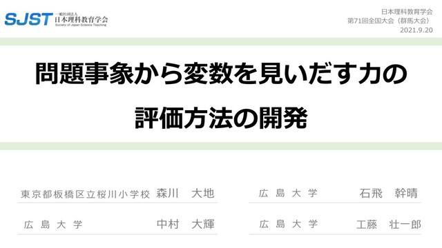 川 ⼩ 学 校 森川 ⼤地 中村 ⼤輝 広 島 ⼤ 学 ⽯⾶ 幹晴 ⼯藤 壮⼀郎 広 島 ⼤ 学 広 島 ⼤ 学 ⽇本理科教育学会 第71回全国⼤会(群⾺⼤会) 2021.9.20