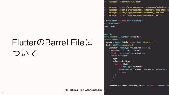 FlutterͷBarrel Fileʹ ͍ͭͯ 2023/07/24 Daiki Asahi (ashdik) 1