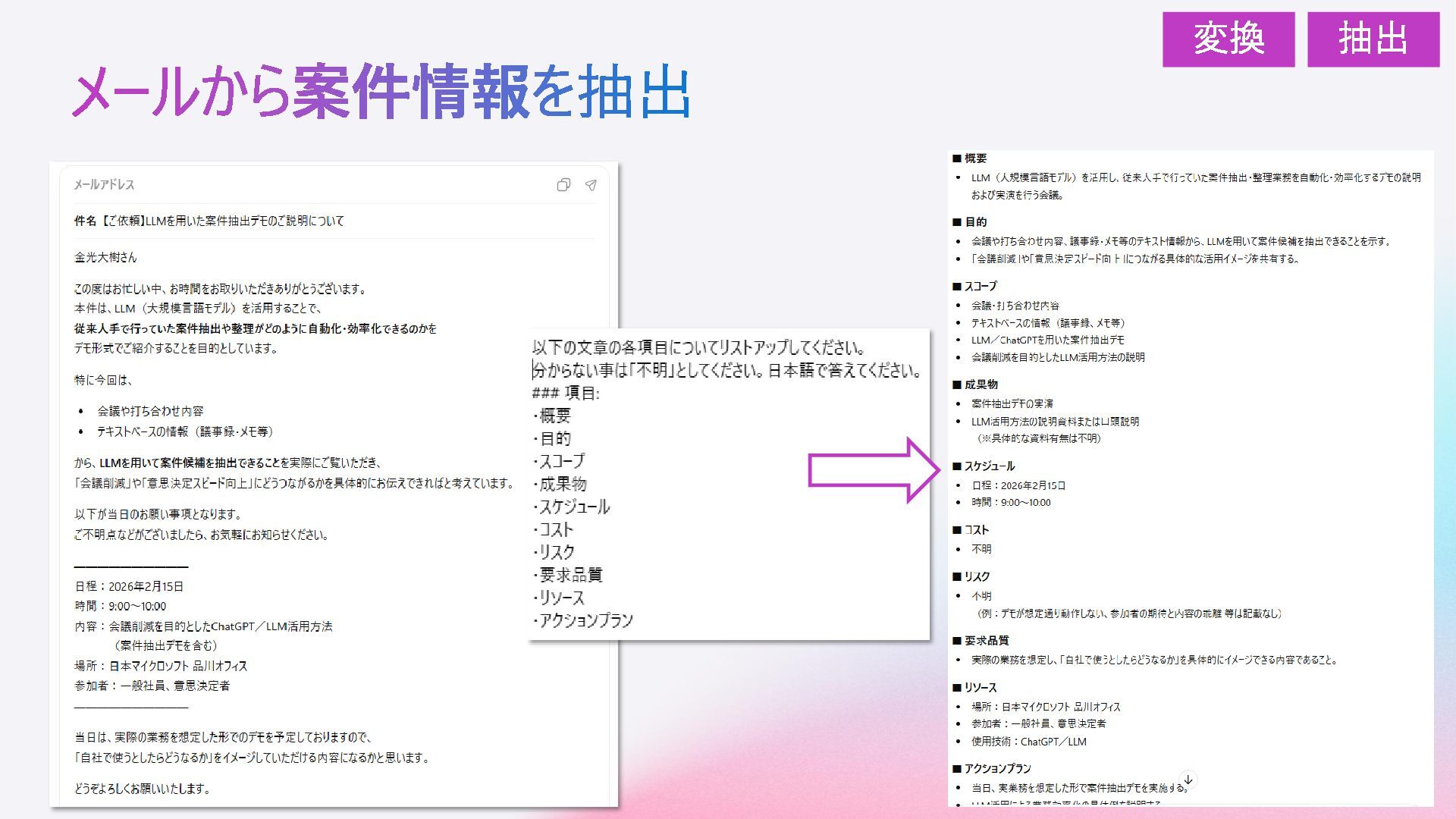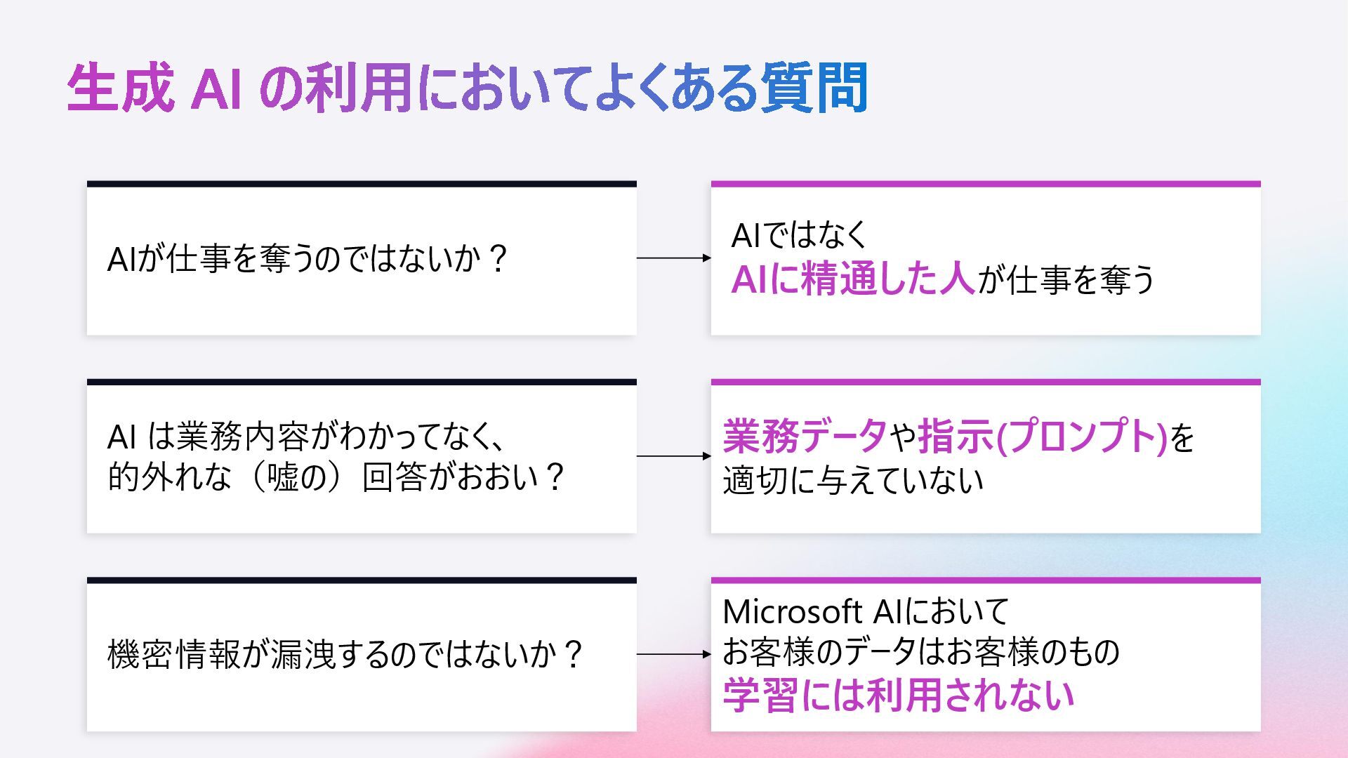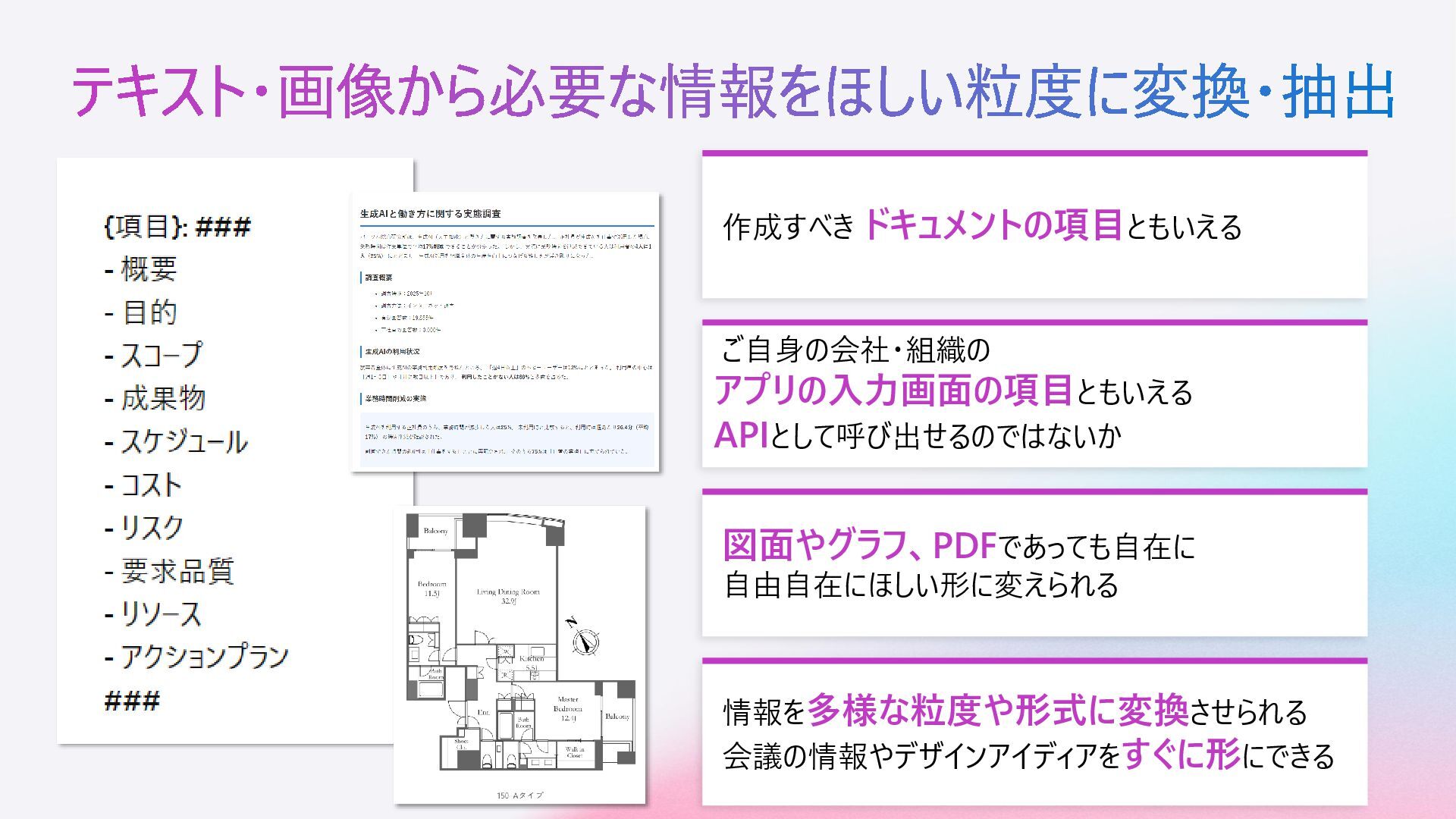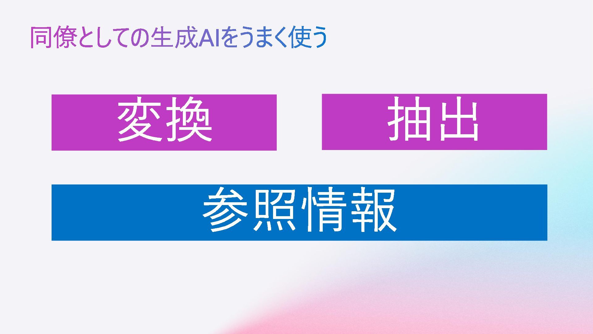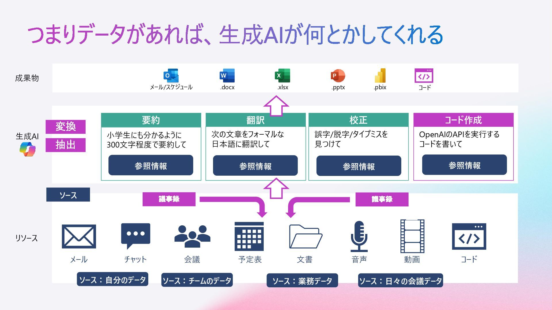 議事録 要約 小学生にも分かるように 300文字程度で要約して 校正 誤字/脱字/タイプミスを 見つけて コード作成 OpenAIのAPIを実行する コードを書いて 翻訳 次の文章をフォーマルな 日本語に翻訳して 成果物 .docx .xlsx .pptx .pbix メール/スケジュール リソース コード ソース:自分のデータ ソース:チームのデータ ソース:業務データ ソース:日々の会議データ ソース 参照情報 参照情報 参照情報 参照情報 議事録 変換 抽出